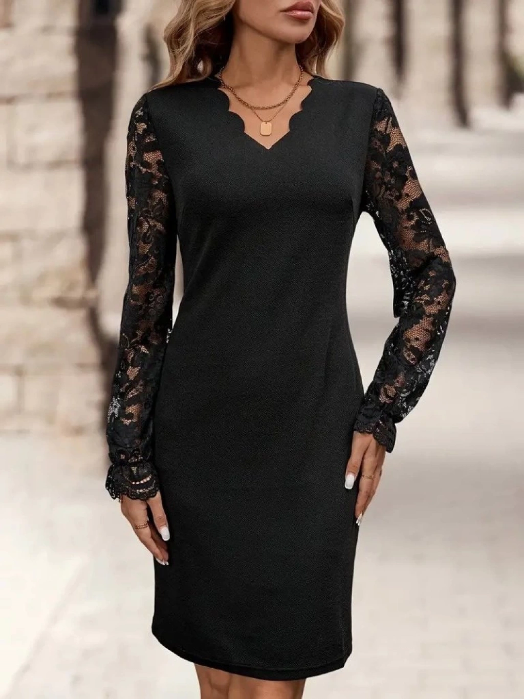 Kadın Uzun Kollu V Lazer Kesim Detaylı Kısa Ithal Krep Elbise
