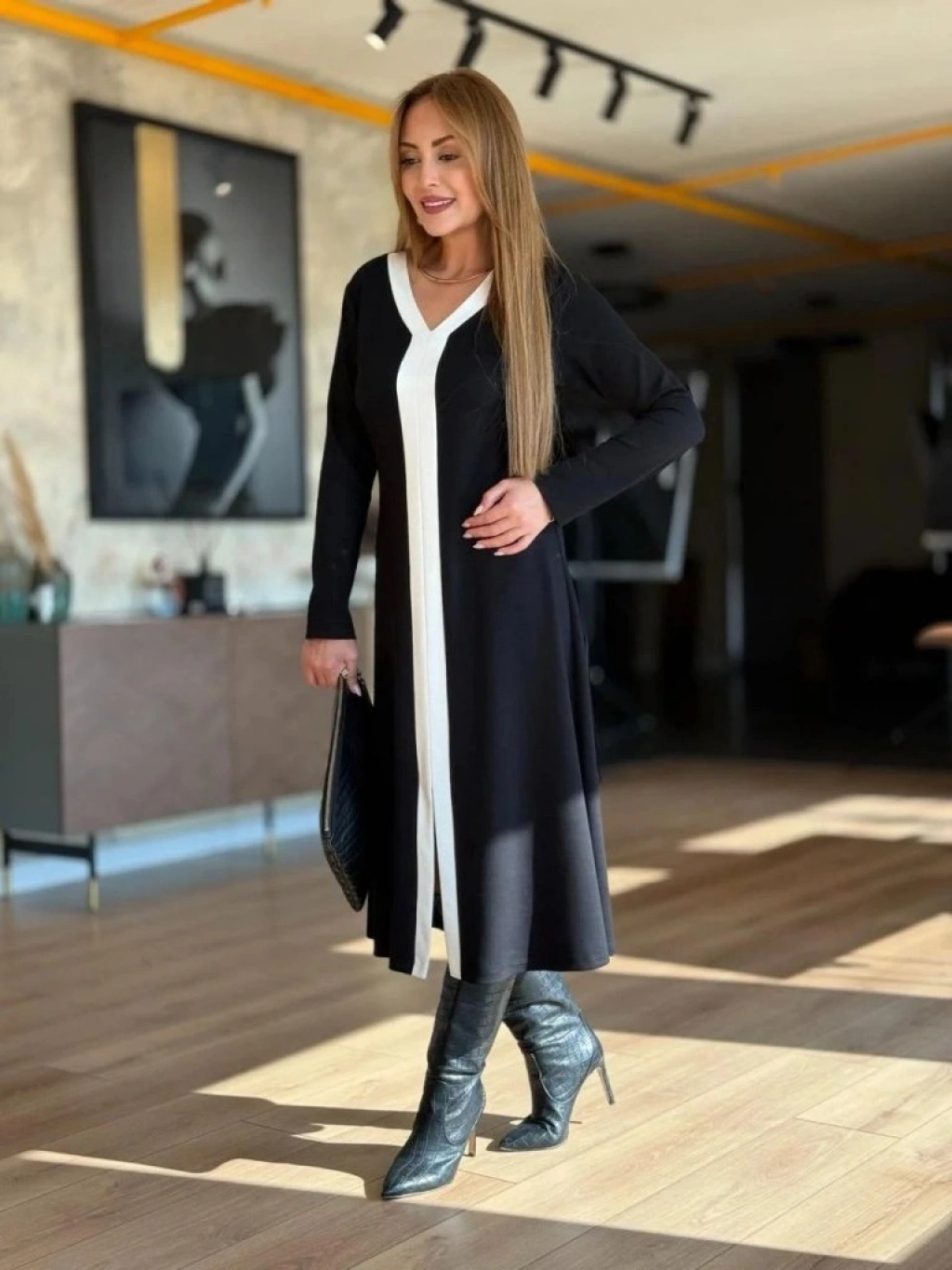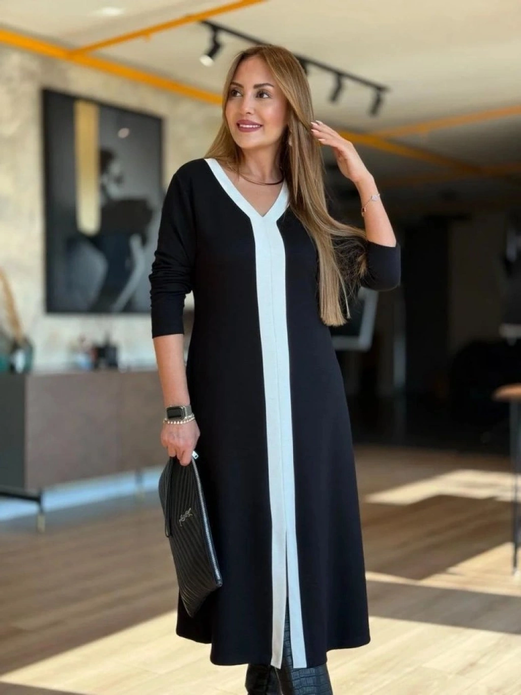 Kadın Uzun Kollu V şerit Yakalı önden Kısa Yırtmaçlı Detaylı Midi Viskon Iki Iplik Elbise