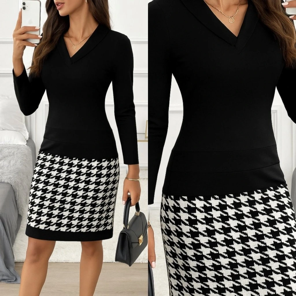 Kadın Uzun Kollu V Yaka Alt Tarafı Desenli Dalgıç Mini Boy Elbise
