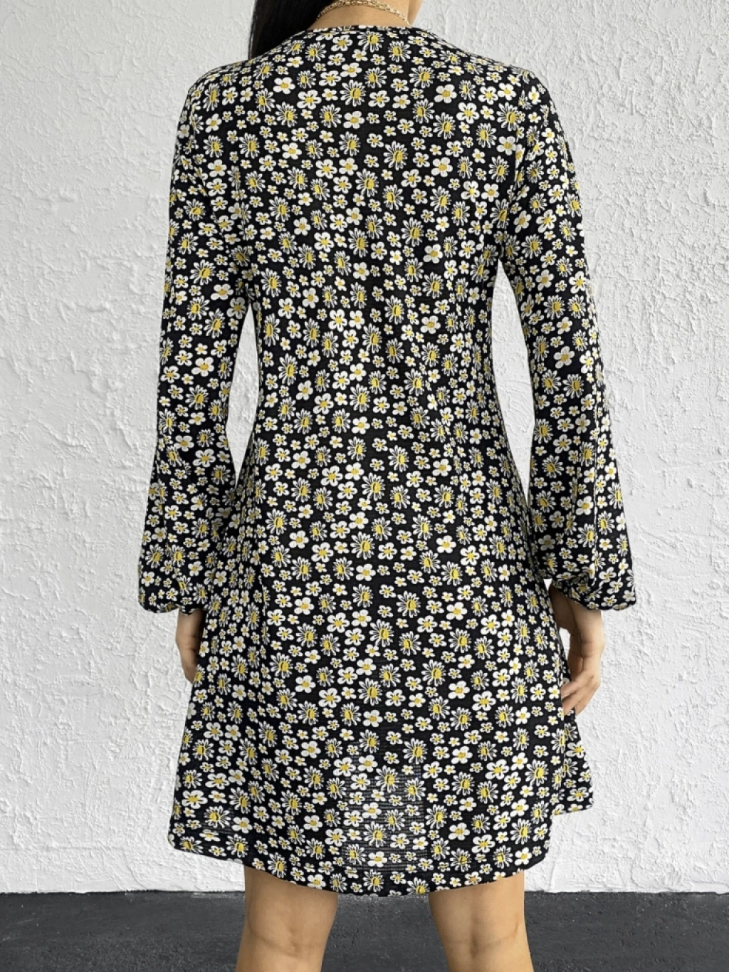 Kadın Uzun Kollu V Yaka çiçek Desenli Helen Kumaş Elbise