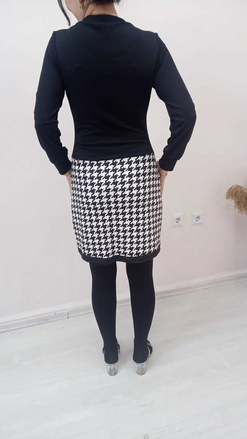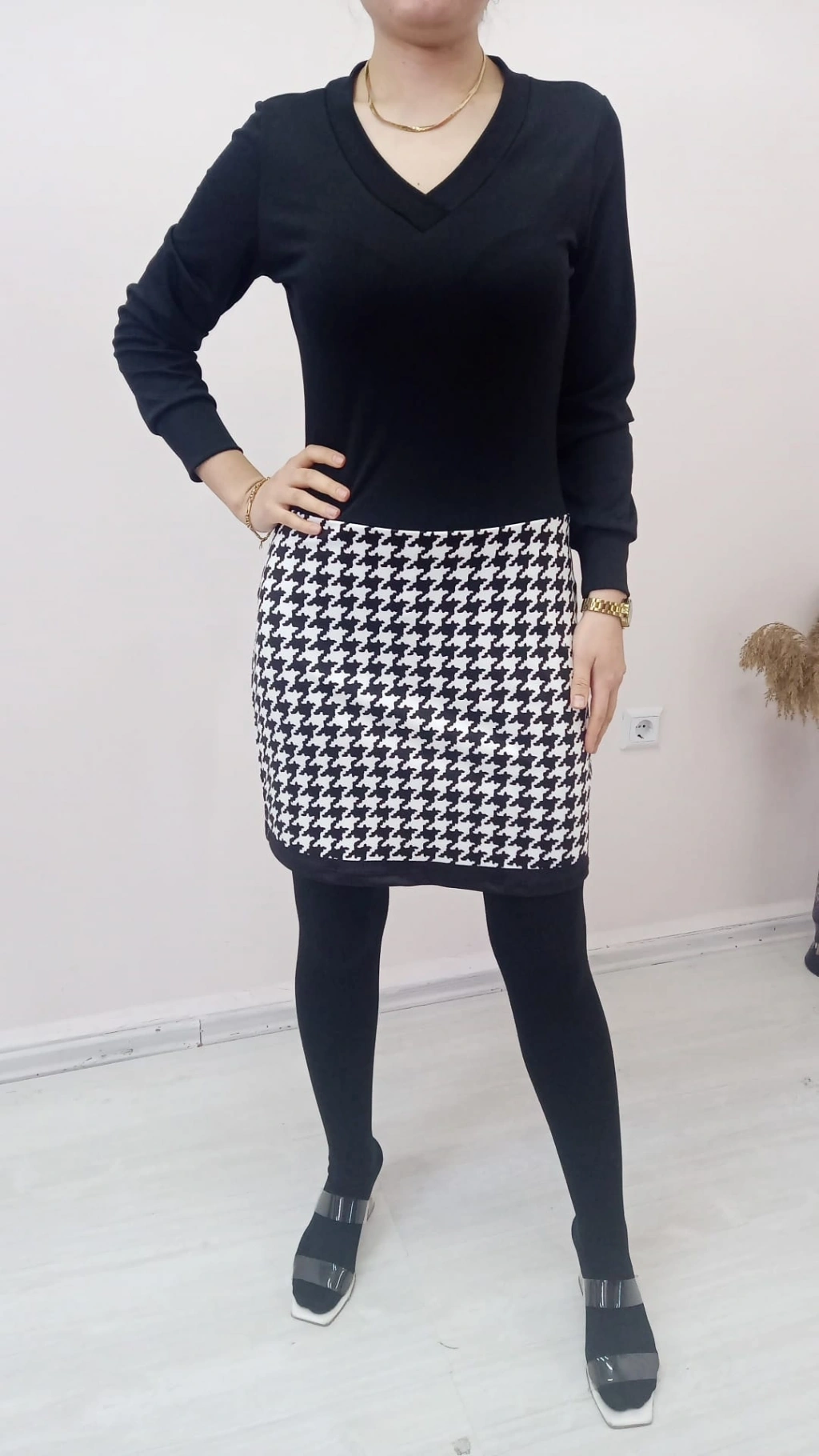 Kadın Uzun Kollu V Yaka Kazayağı Desen Dalgıç Kumaş Elbise