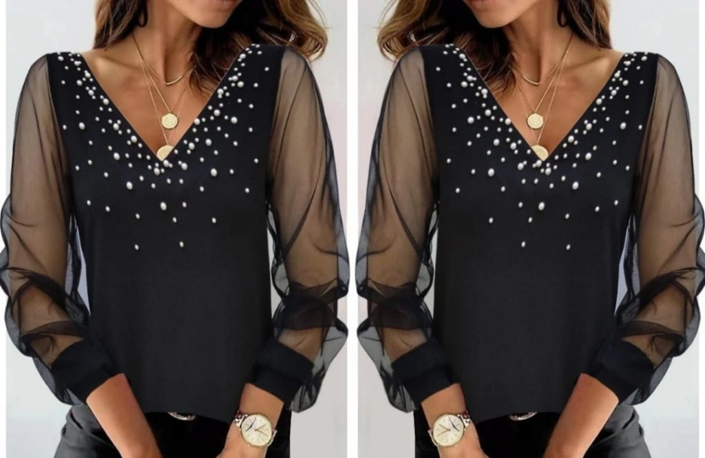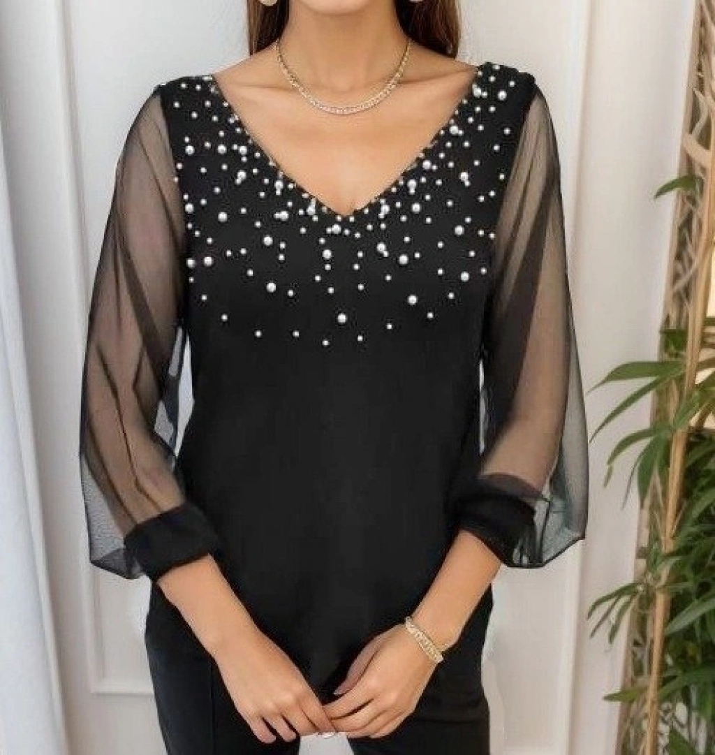 Kadın Uzun Kollu V Yaka Kolları Tül Yaka Kenarı Ve Göğüs Inci Detay Krep Bluz