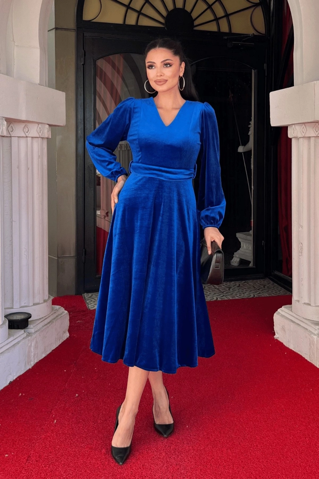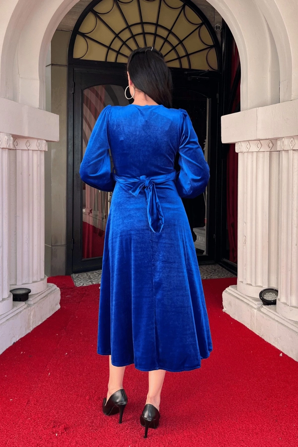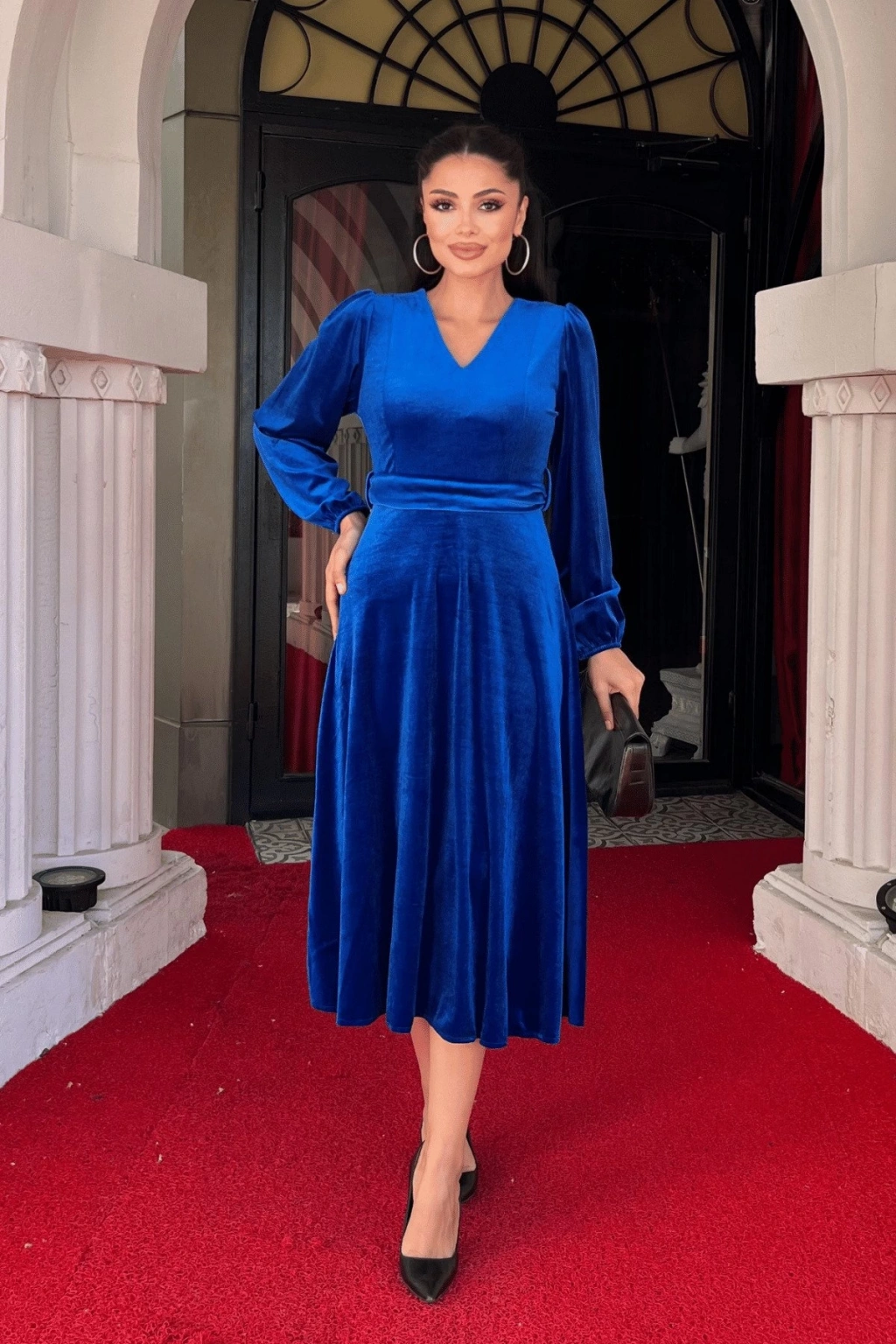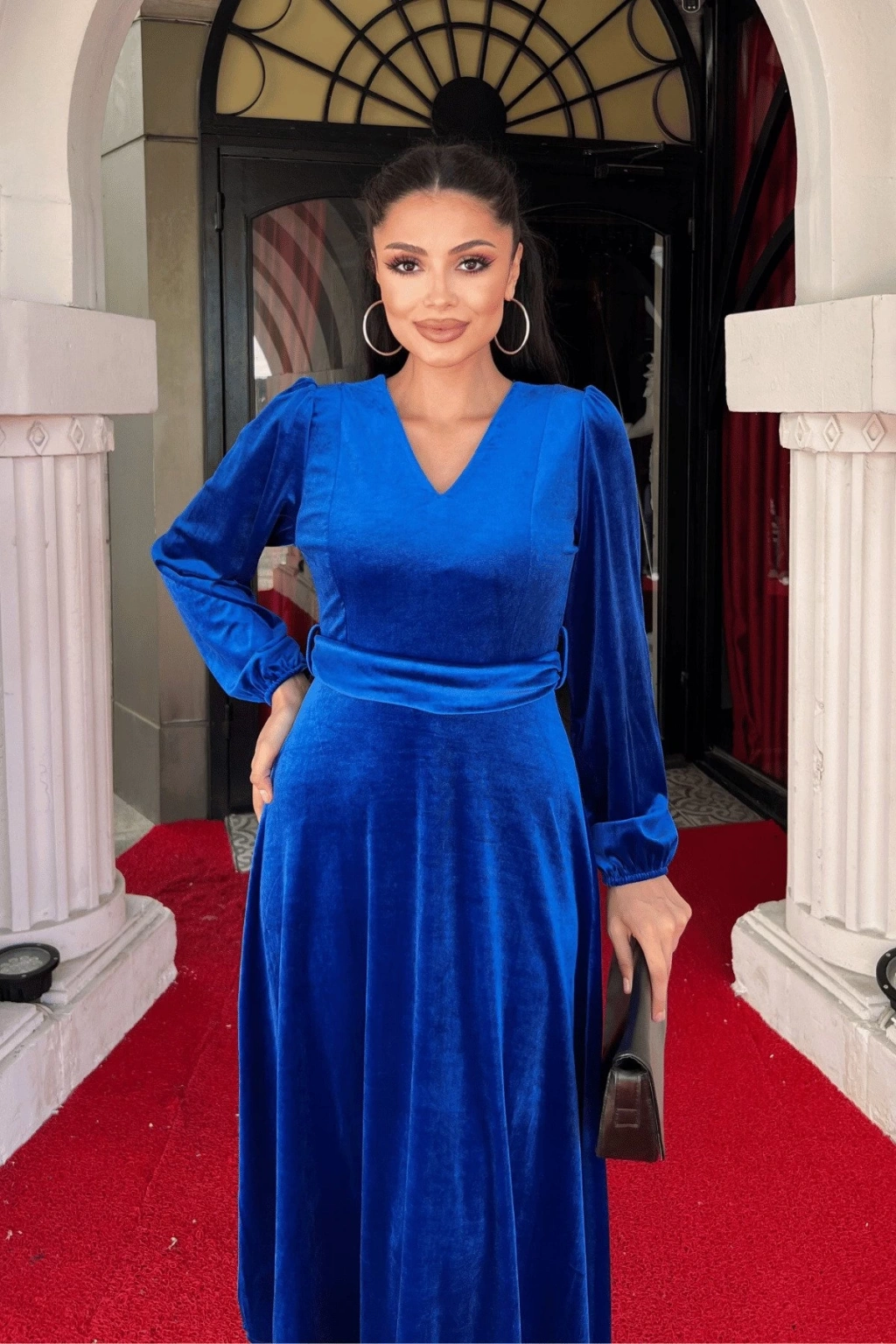Kadın Uzun Kollu V Yaka Kuşak Dahil Kadife Kumaş Midi Boy Elbise