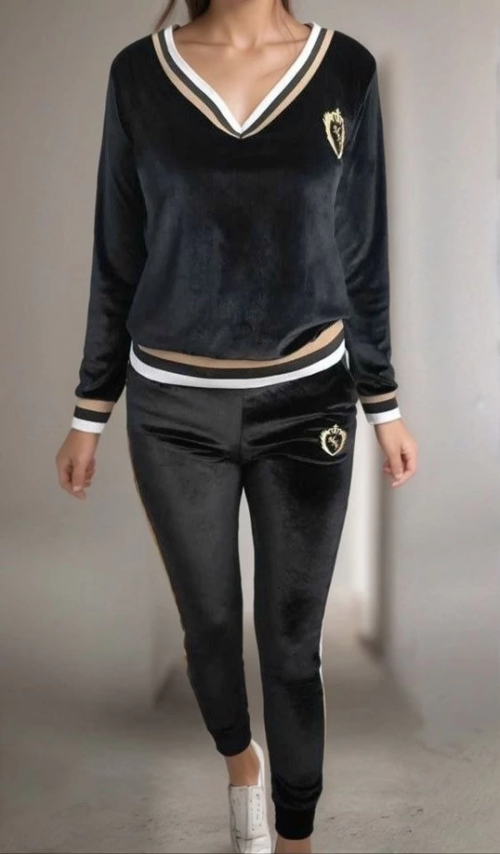 Kadın Uzun Kollu V Yaka Yakası Ve Kol Ağzı şerit Detay Armalı Kadife Takım