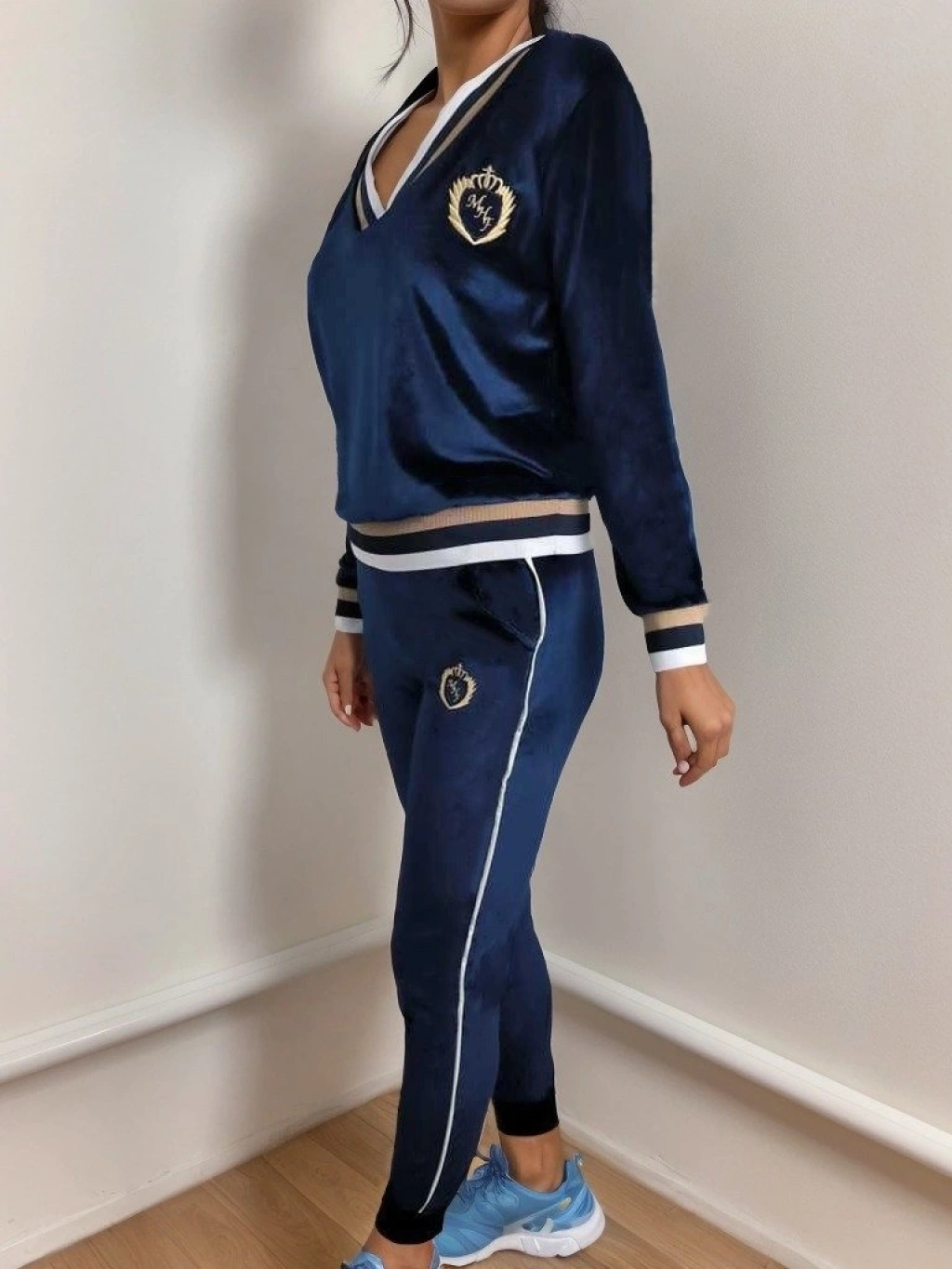 Kadın Uzun Kollu V Yaka Yakası Ve Kol Ağzı şerit Detay Armalı Kadife Takım