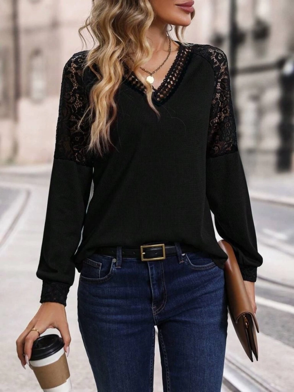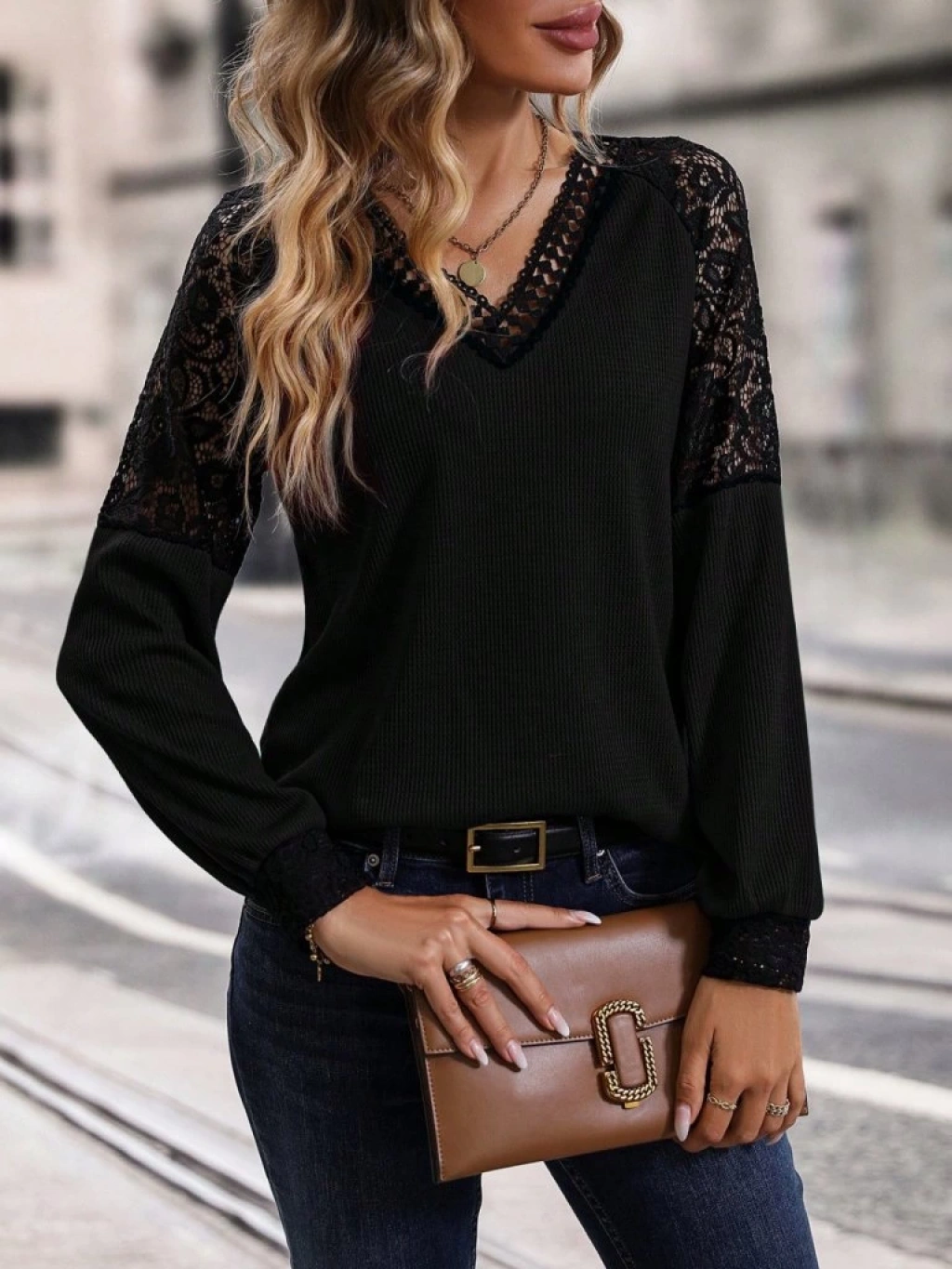 Kadın Uzun Kollu V Yakalı Dantelli Waffle Bluz