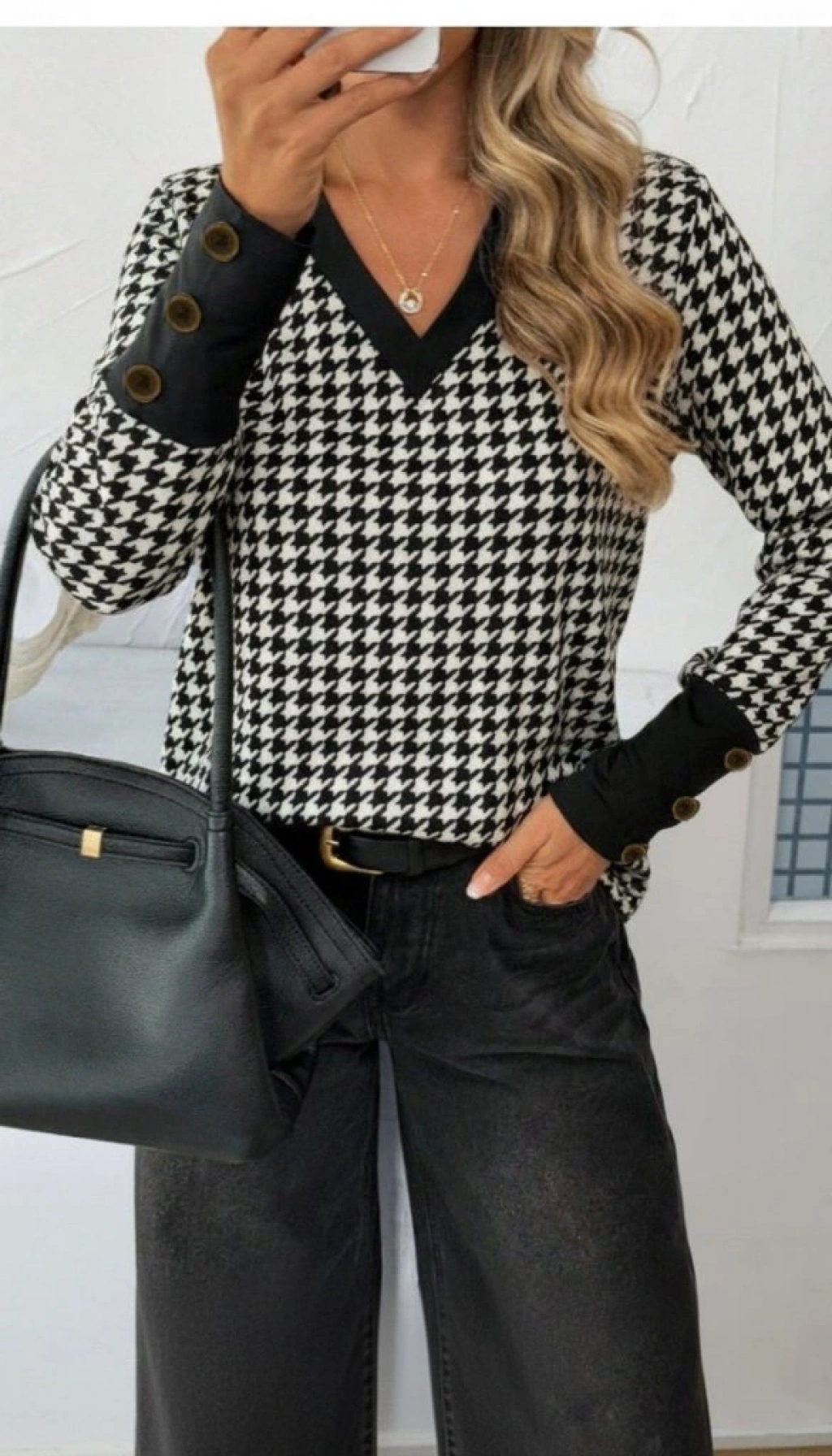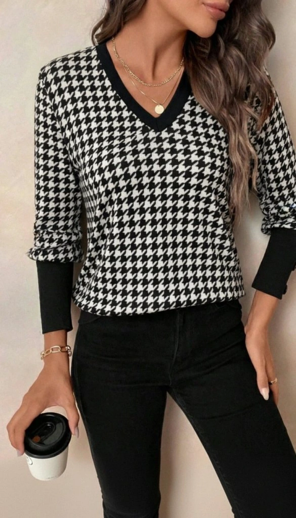 Kadın Uzun Kollu V Yakalı Desenli Süprem Bluz