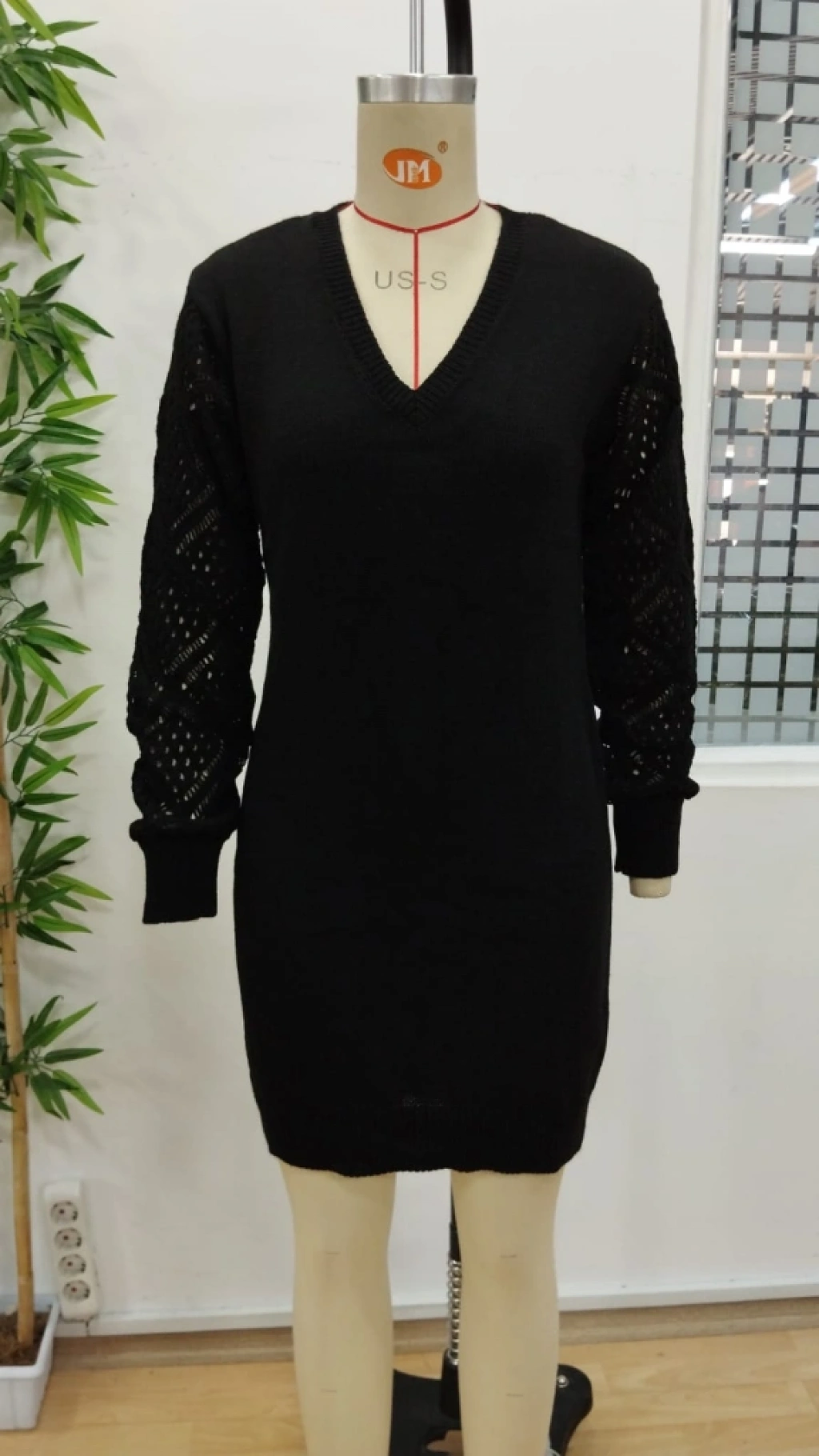 Kadın Uzun Kollu V Yakalı Mini Triko Elbise