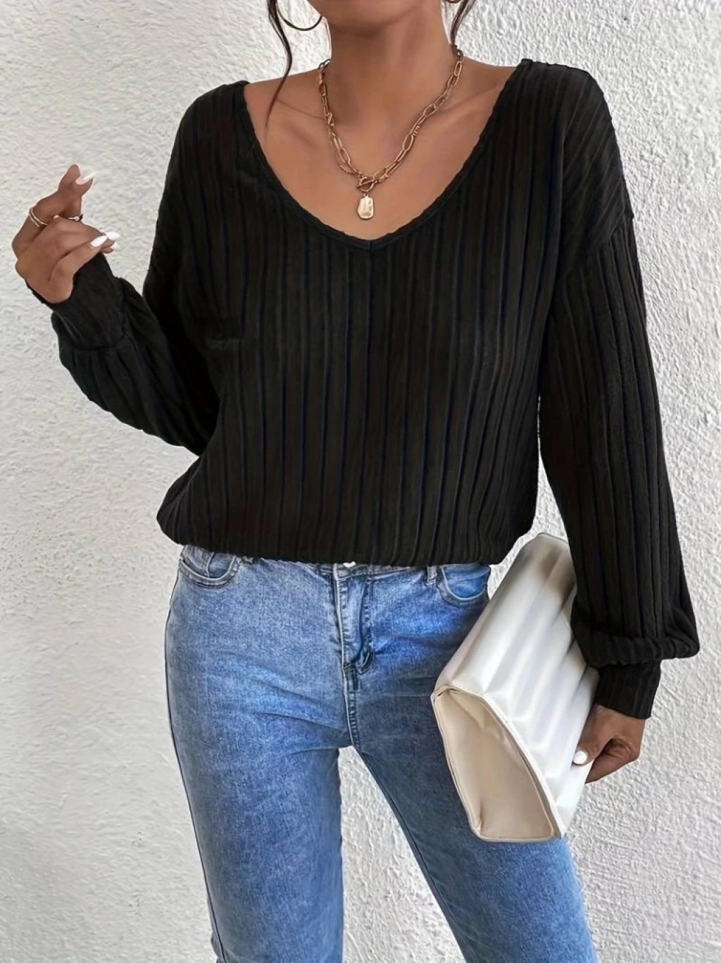 Kadın Uzun Kollu V Yakalı Pencere Sırt Dantel Detaylı Kalın Fitilli Kaşkorse Bluz