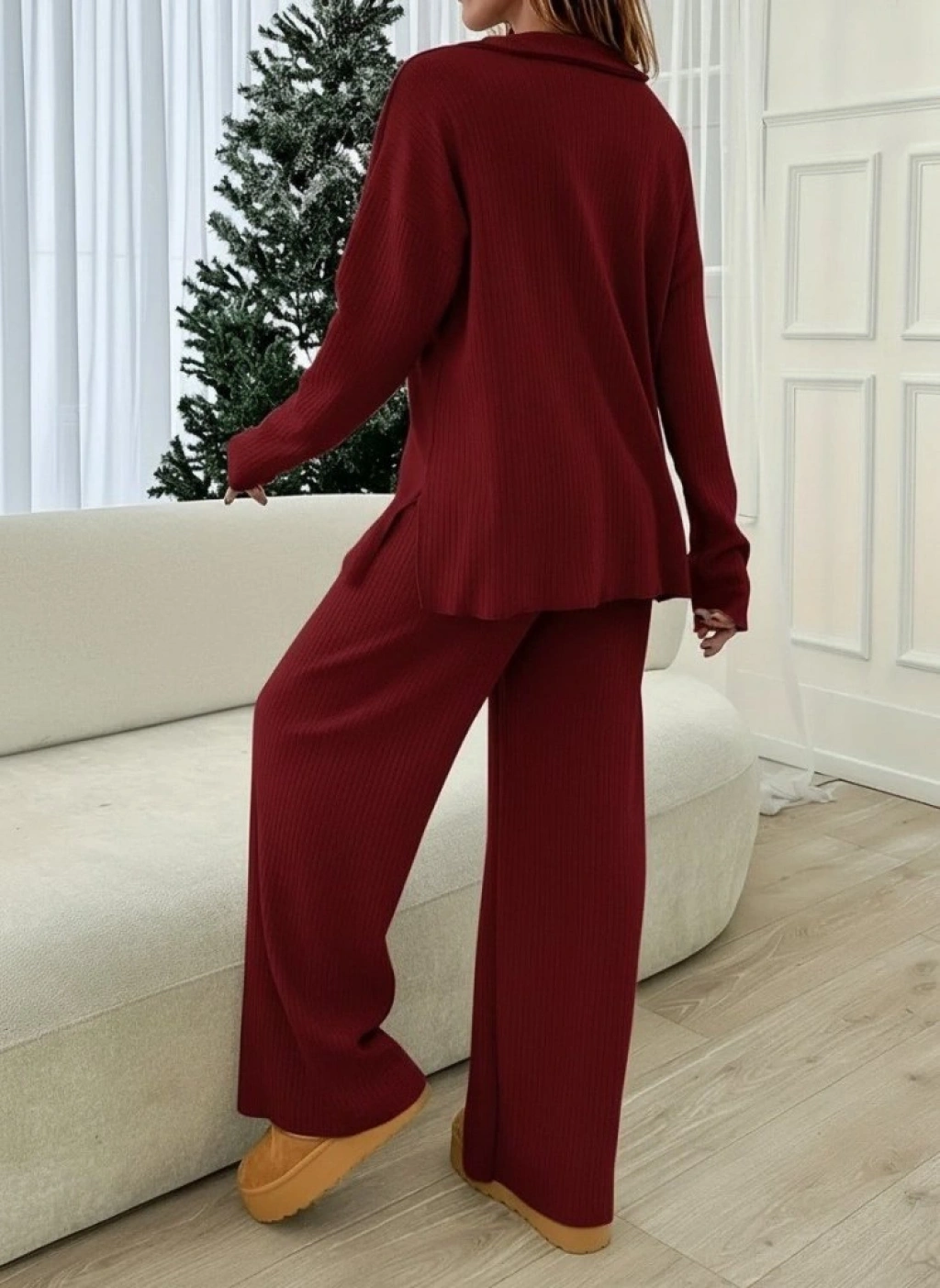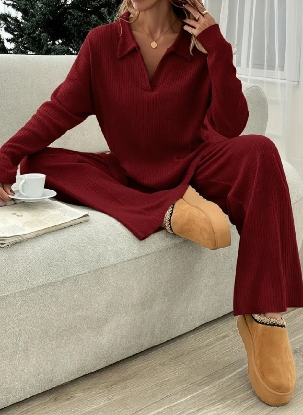 Kadın Uzun Kollu V Yakalı şardonlu Kaşkorse Bluz Ve Pantolon Ikili Takım