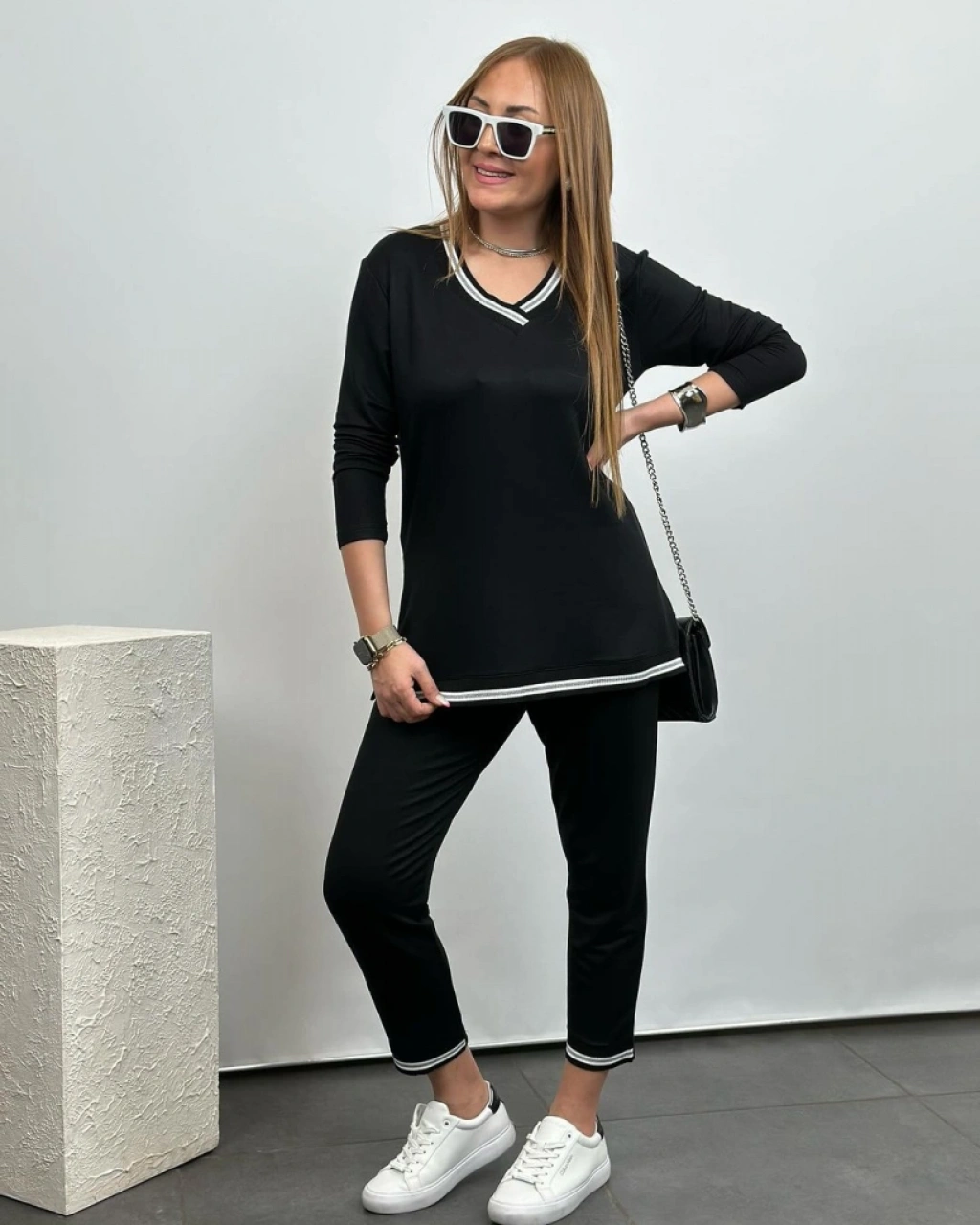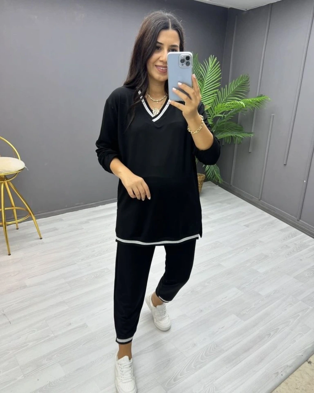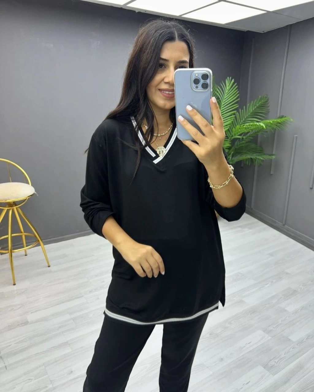Kadın Uzun Kollu V Yakalı şerit Detay Alt Ve üst Viskon Iki Iplik Detay Ikili Takım