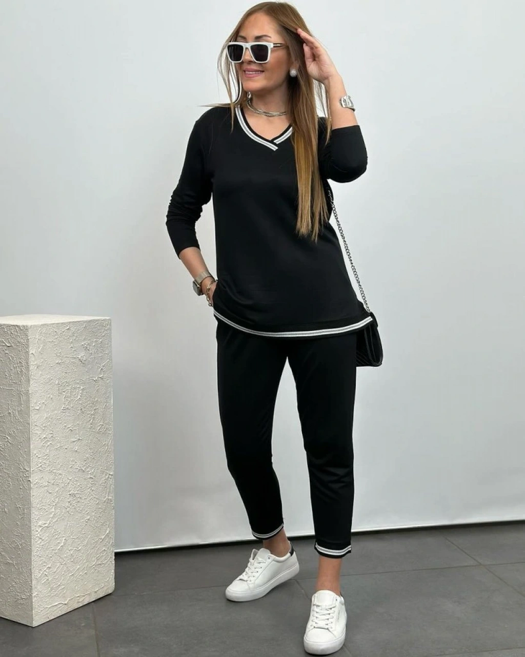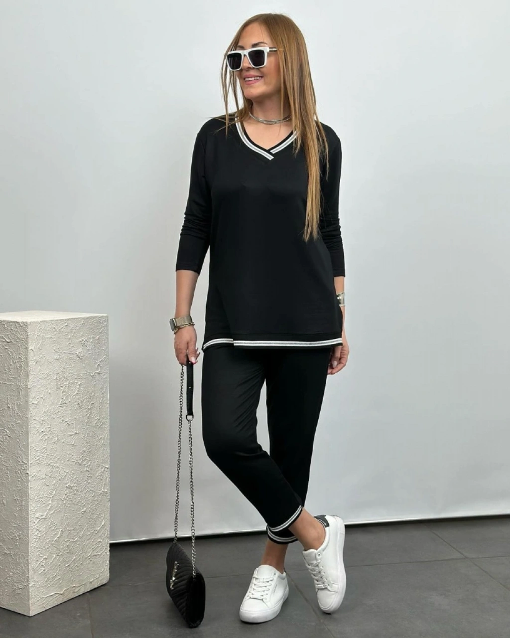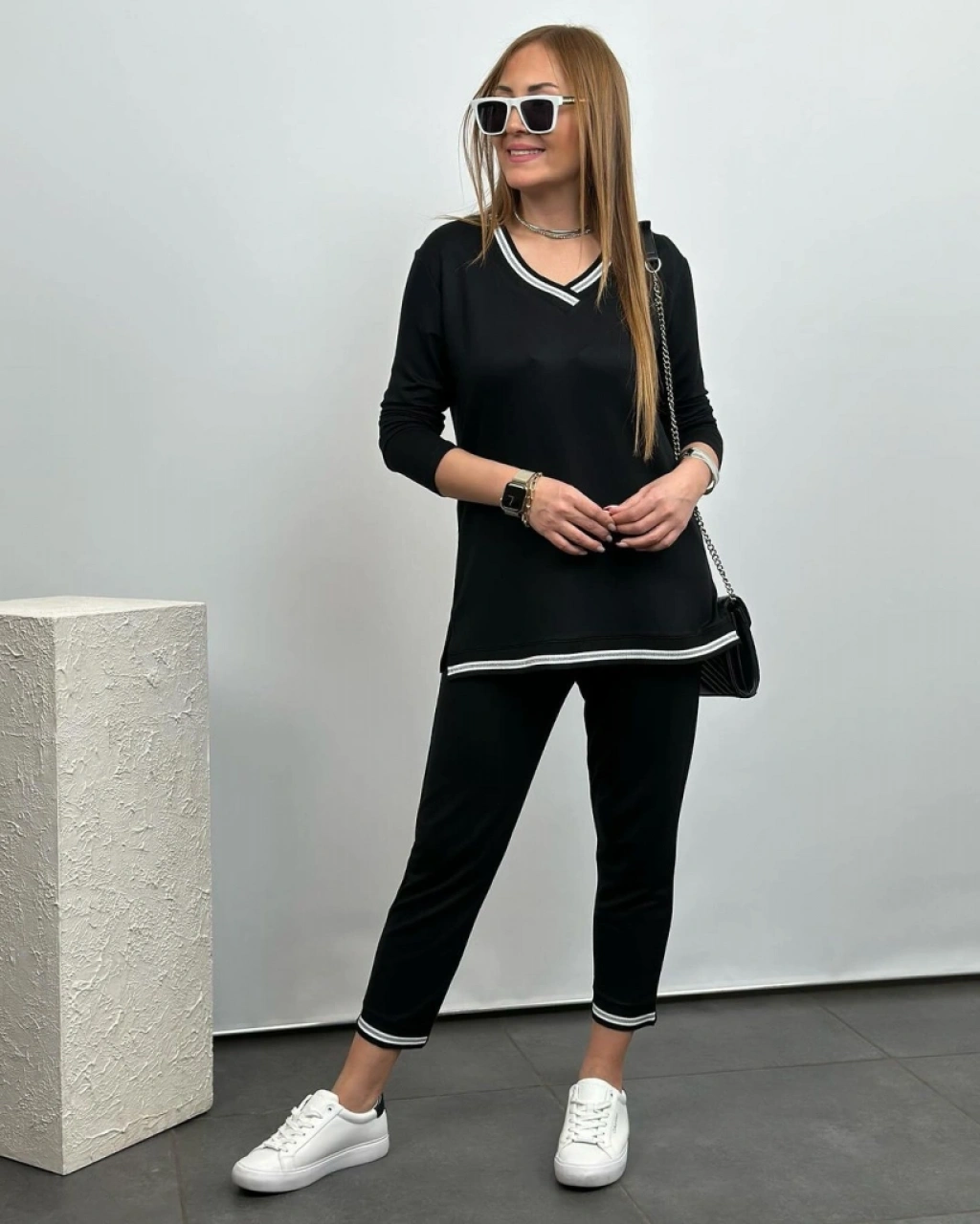 Kadın Uzun Kollu V Yakalı şerit Detay Alt Ve üst Viskon Iki Iplik Detay Ikili Takım