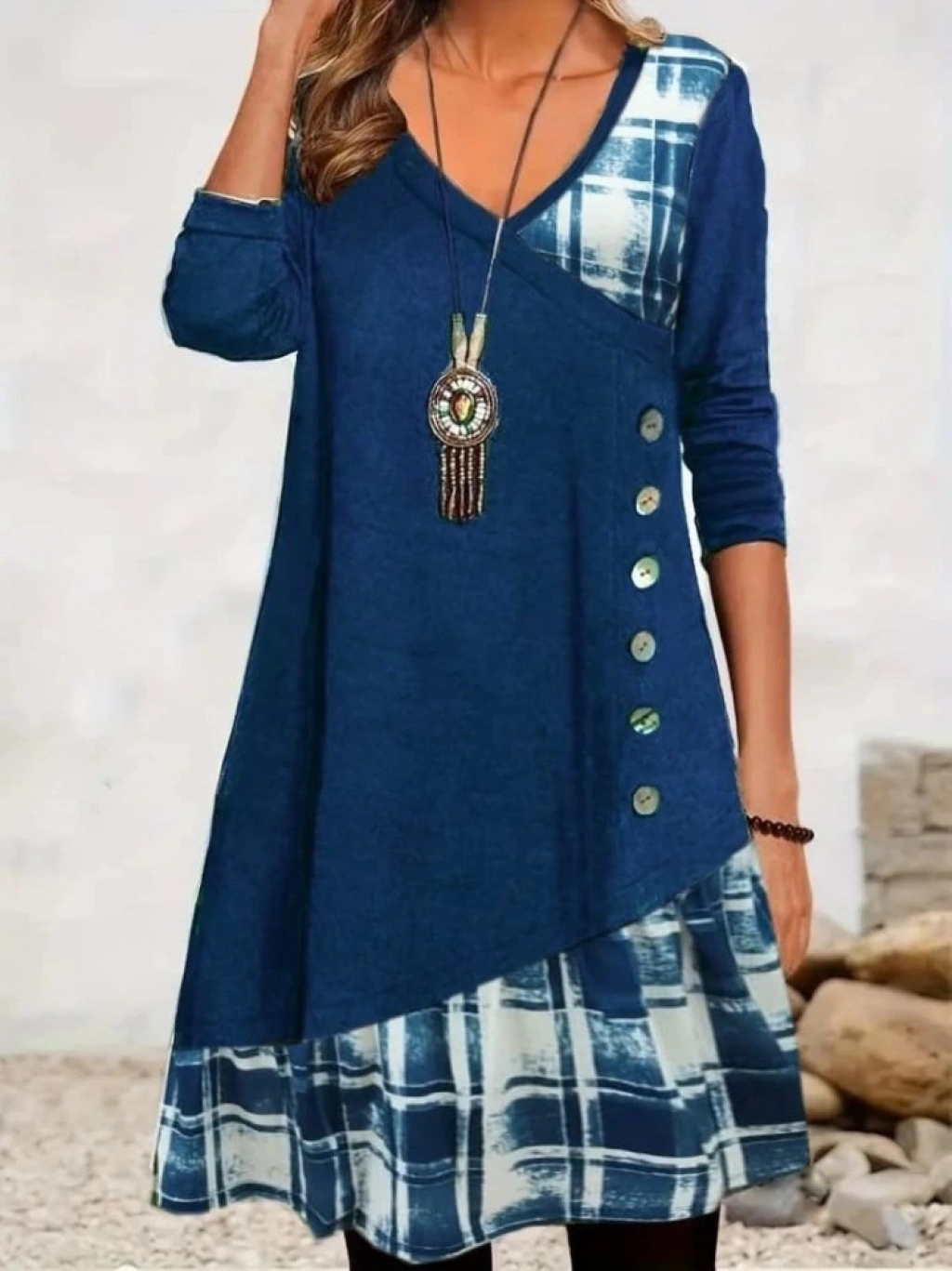Kadın Uzun Kollu V Yakalı Yün Viskon Ve Desenli Süprem Elbise