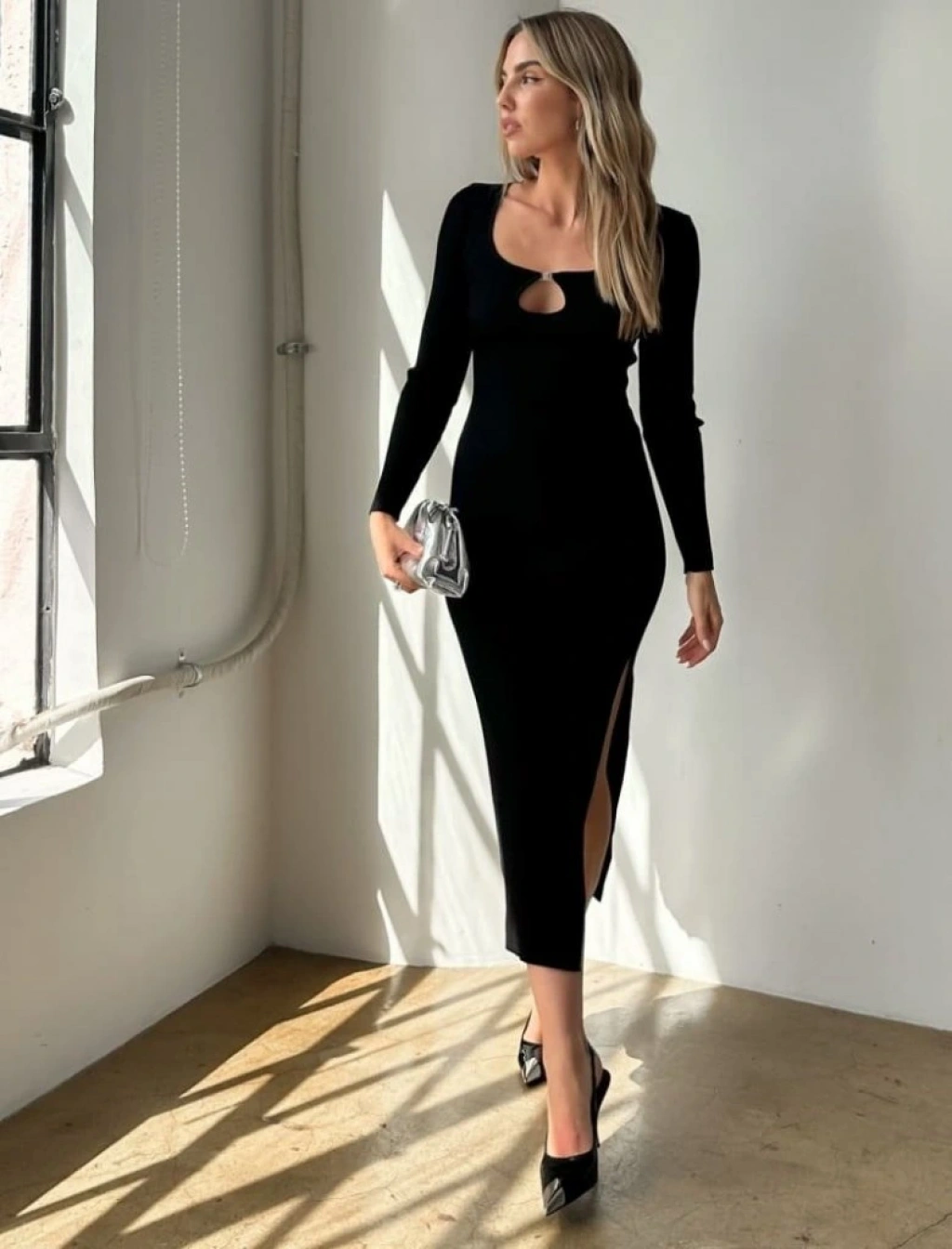 Kadın Uzun Kollu Yaka Damla Detay Mini Aksesuarlı Yırtmaç Detay Krep Elbise