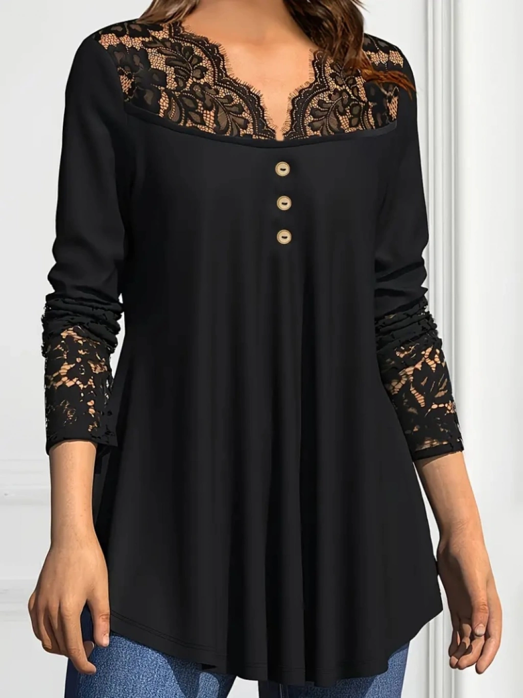 Kadın Uzun Kollu Yaka Kol Ucu Dantel Detaylı önden Düğmeli Viskon Bluz