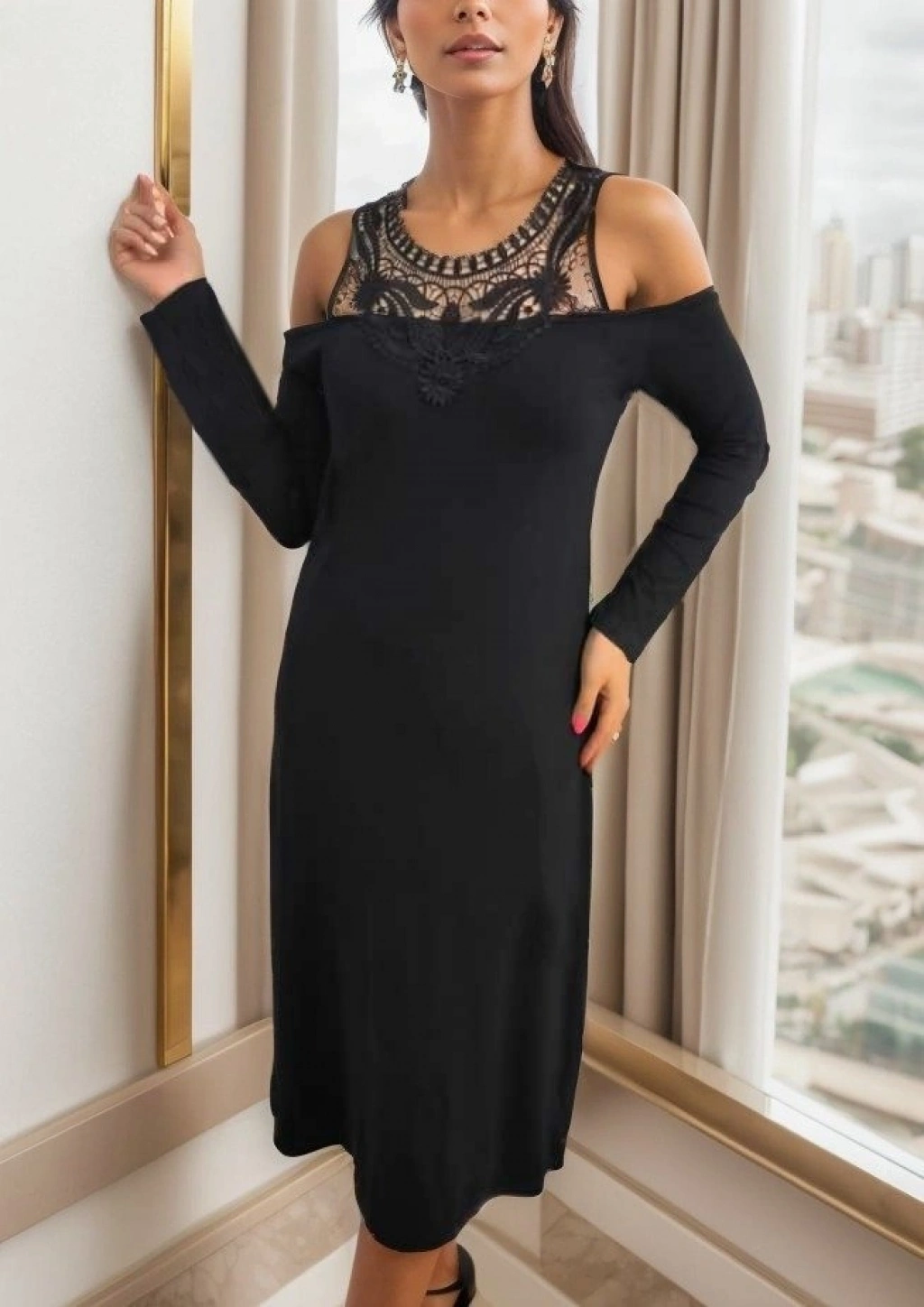Kadın Uzun Kollu Yaka önü Güpürlü Madonna Yaka Viskon Midi Boy Elbise