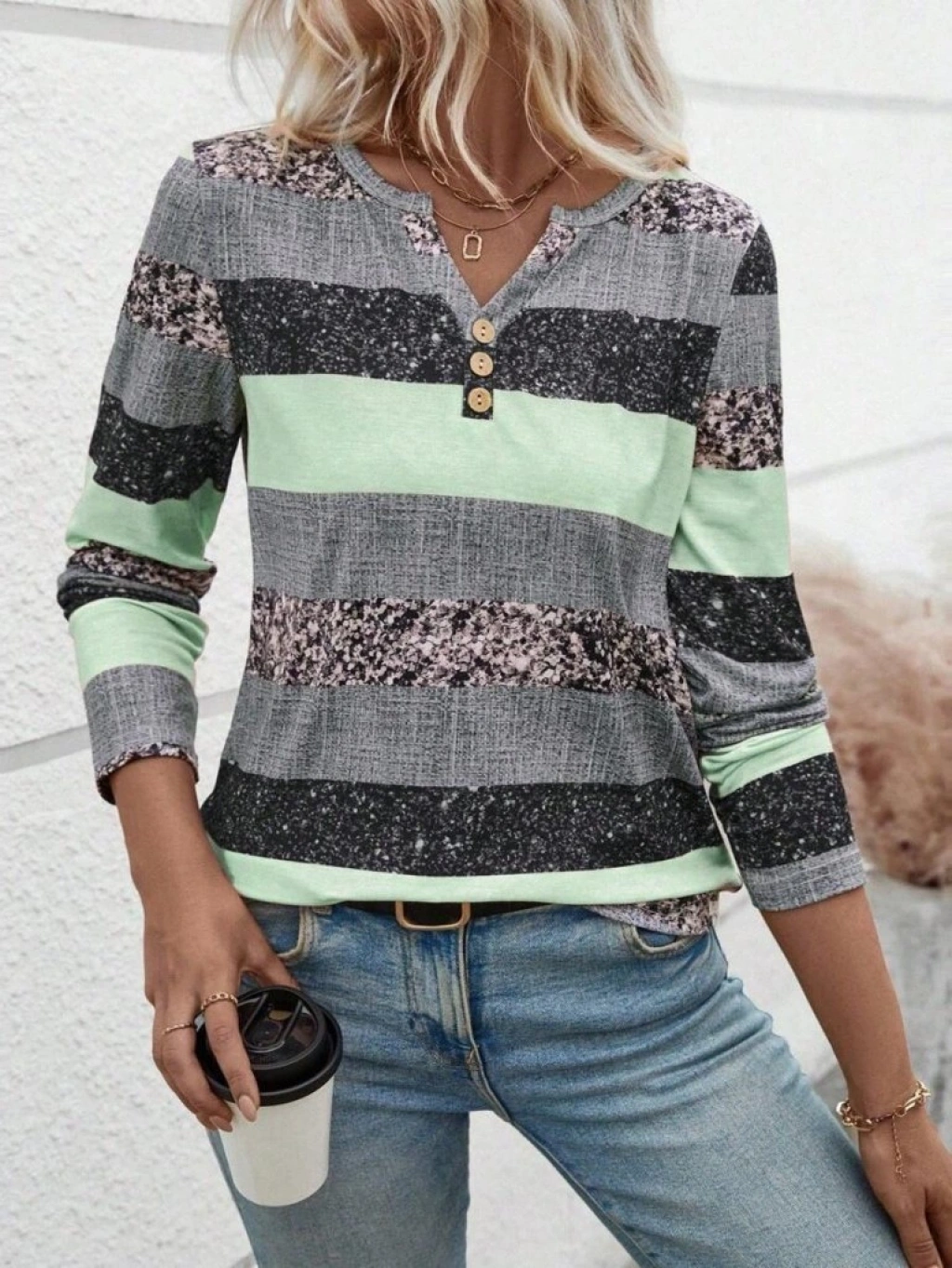 Kadın Uzun Kollu Yakadan Düğmeli çizgili Desenli Süprem Bluz