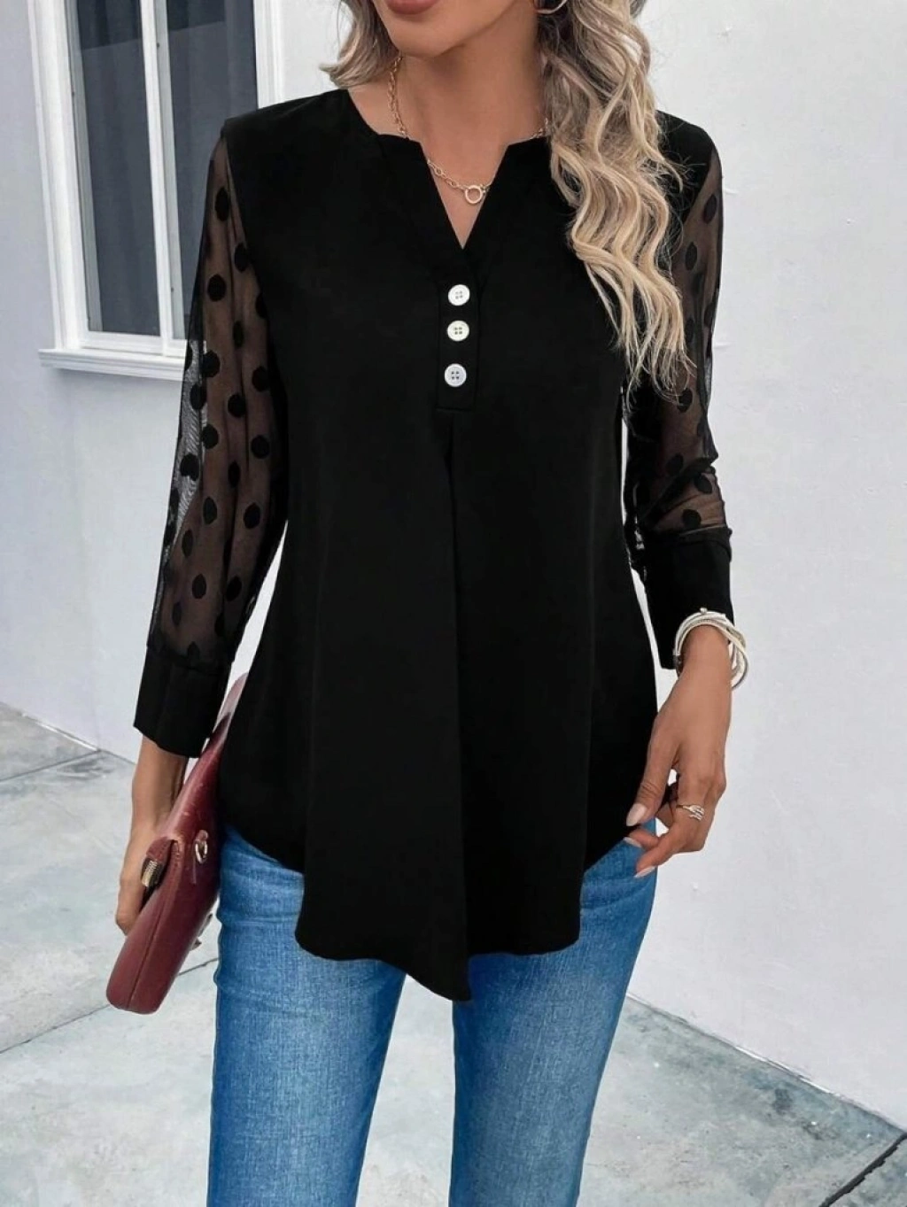 Kadın Uzun Kollu Yakadan Düğmeli Kolları Tül Detaylı Viskon Bluz