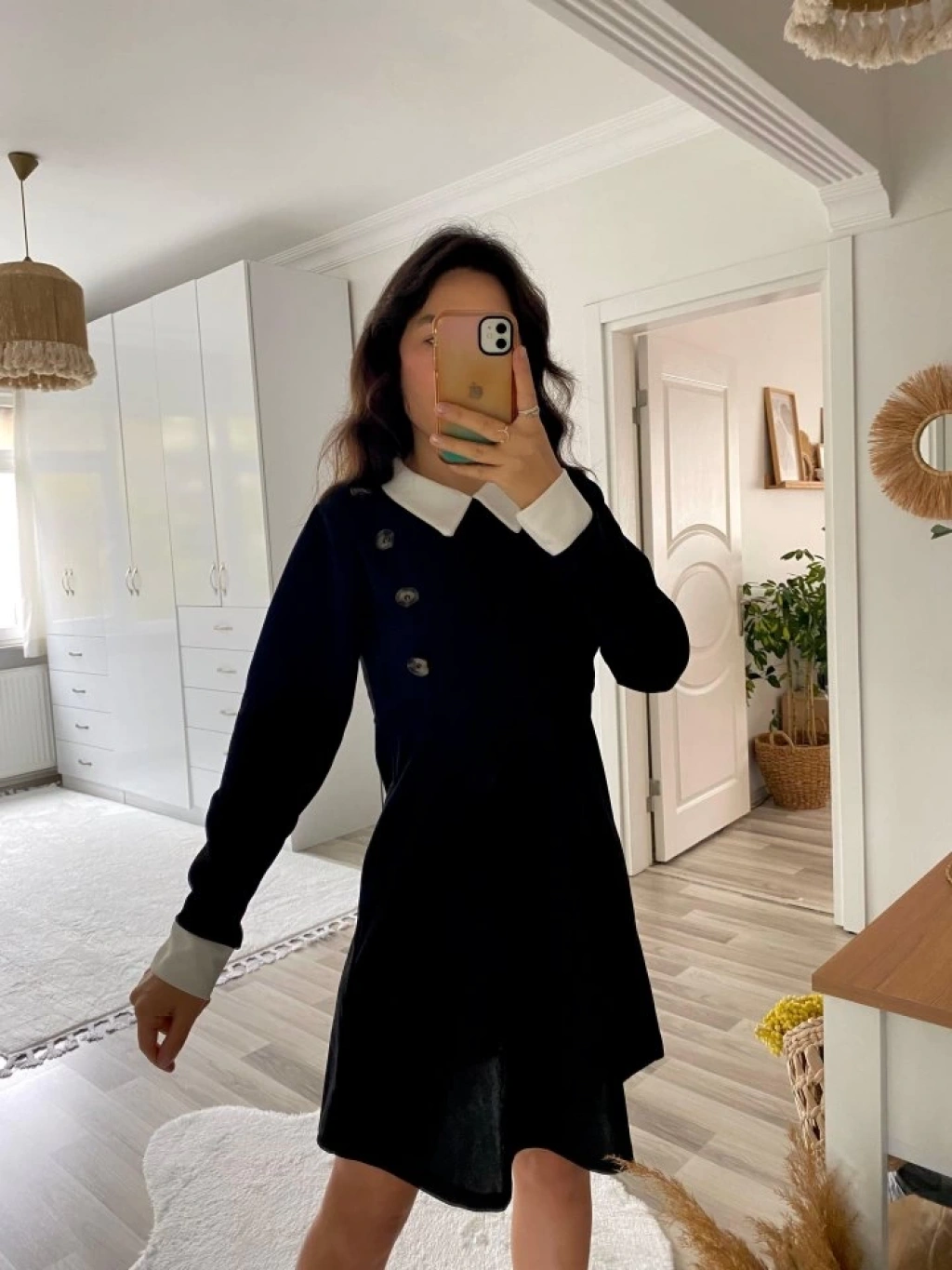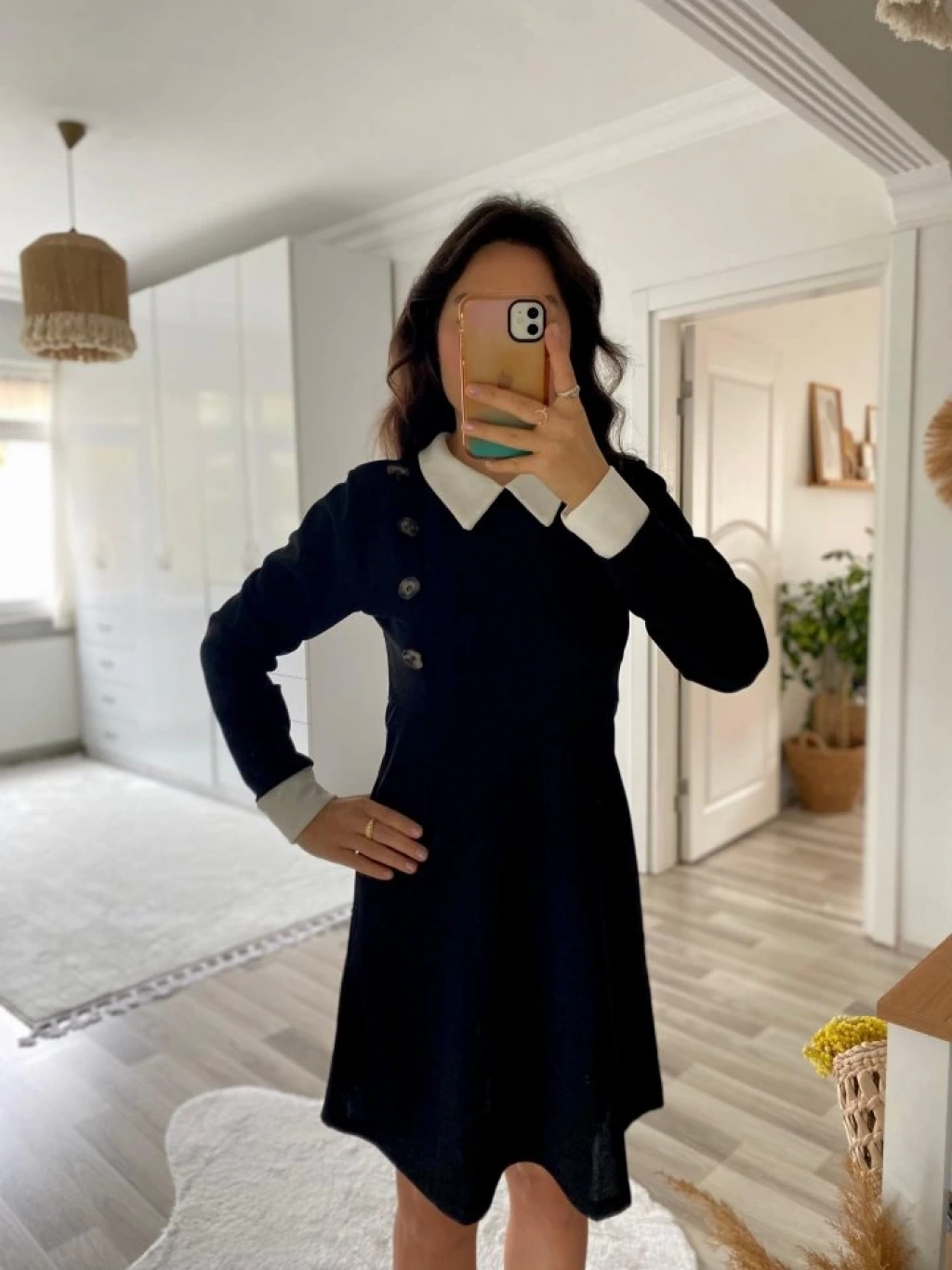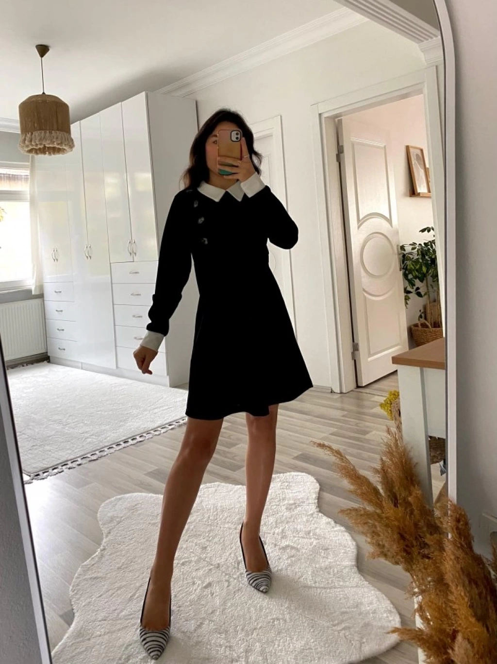 Kadın Uzun Kollu Yakalı A Kesim Kısa Ithal Krep Elbise