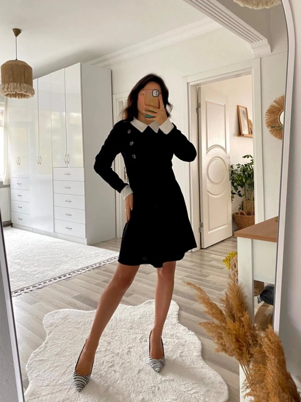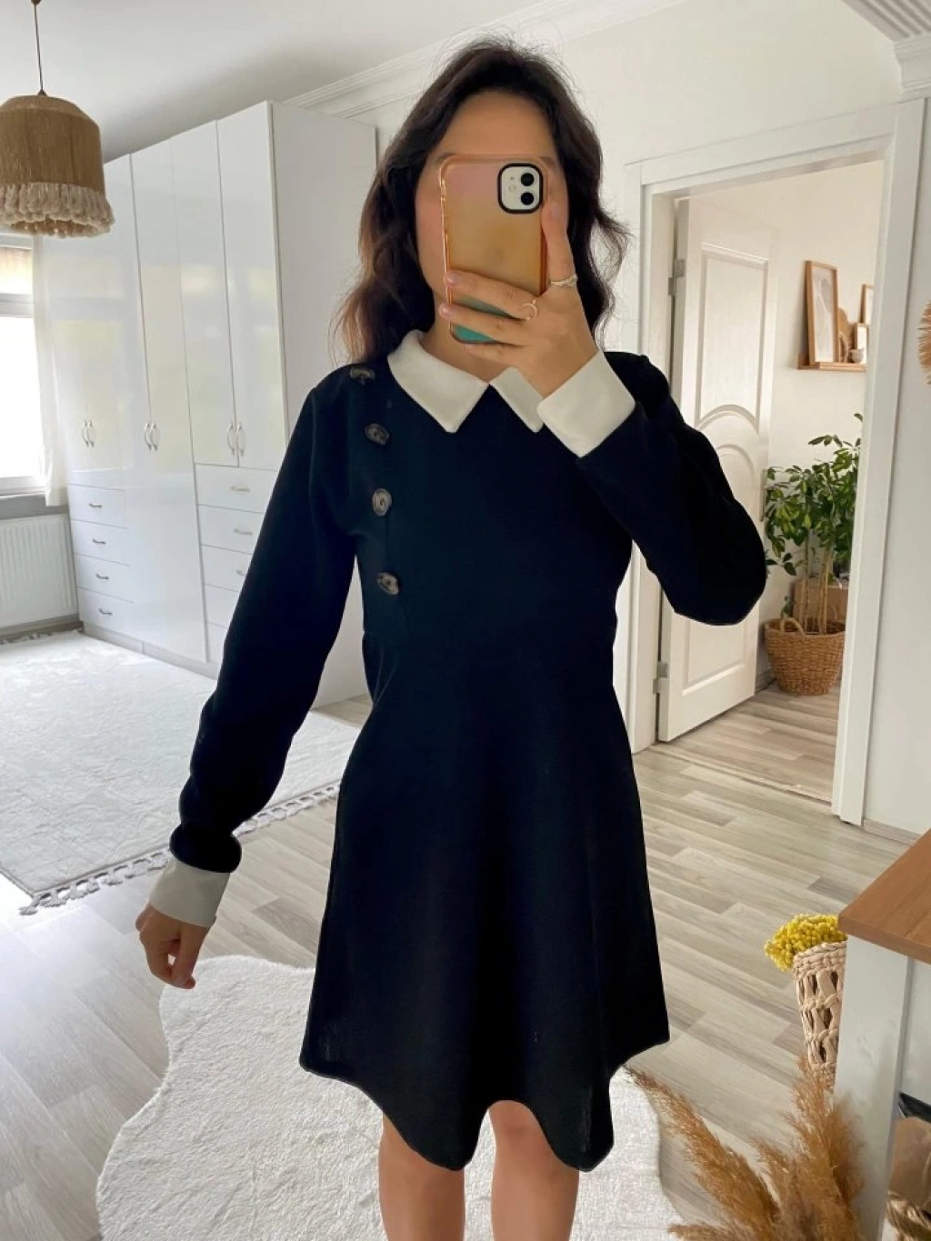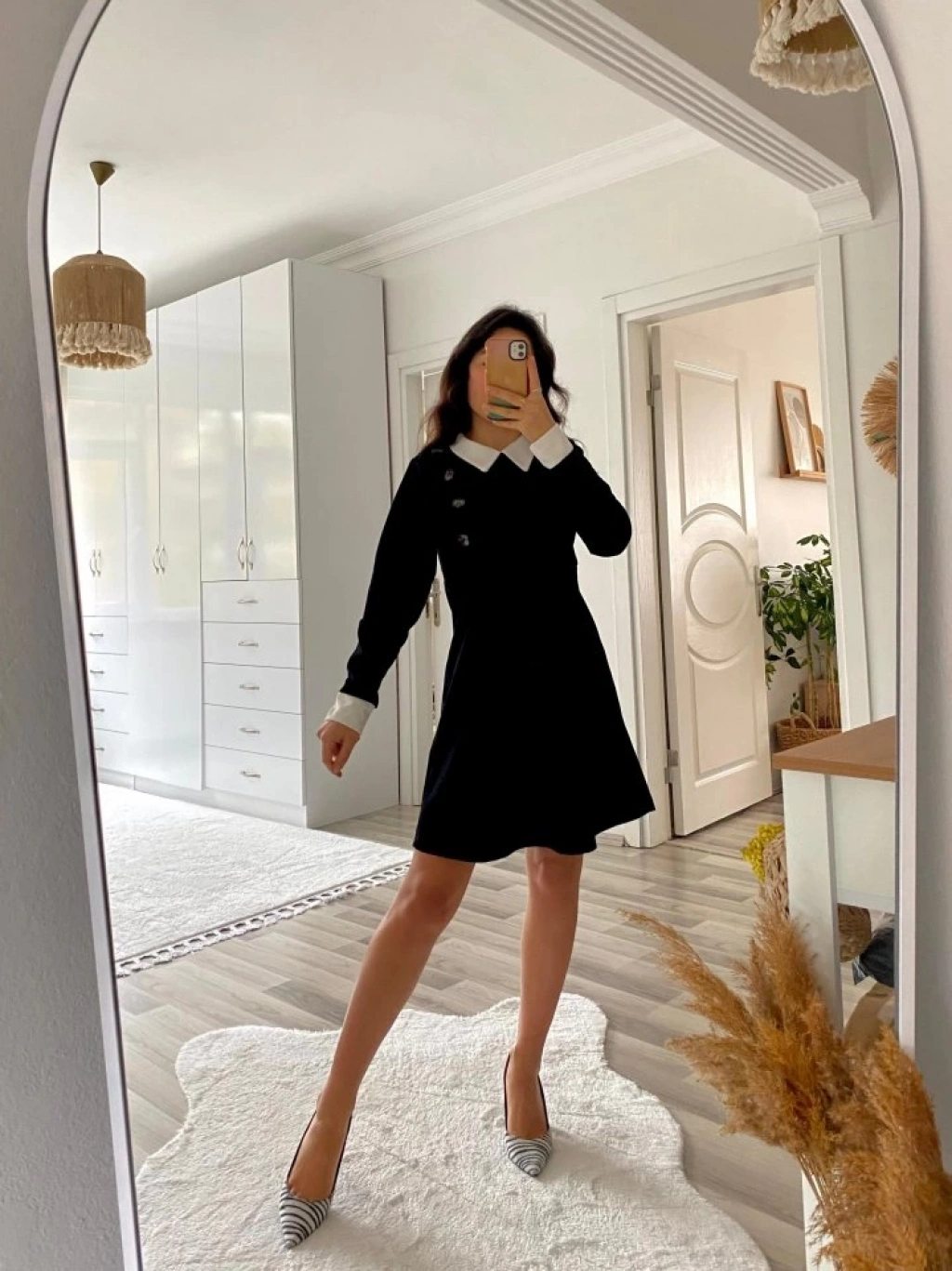 Kadın Uzun Kollu Yakalı A Kesim Kısa Ithal Krep Elbise