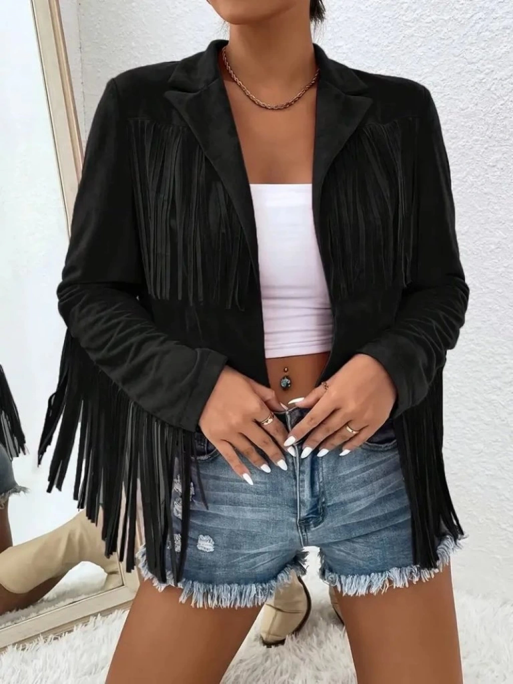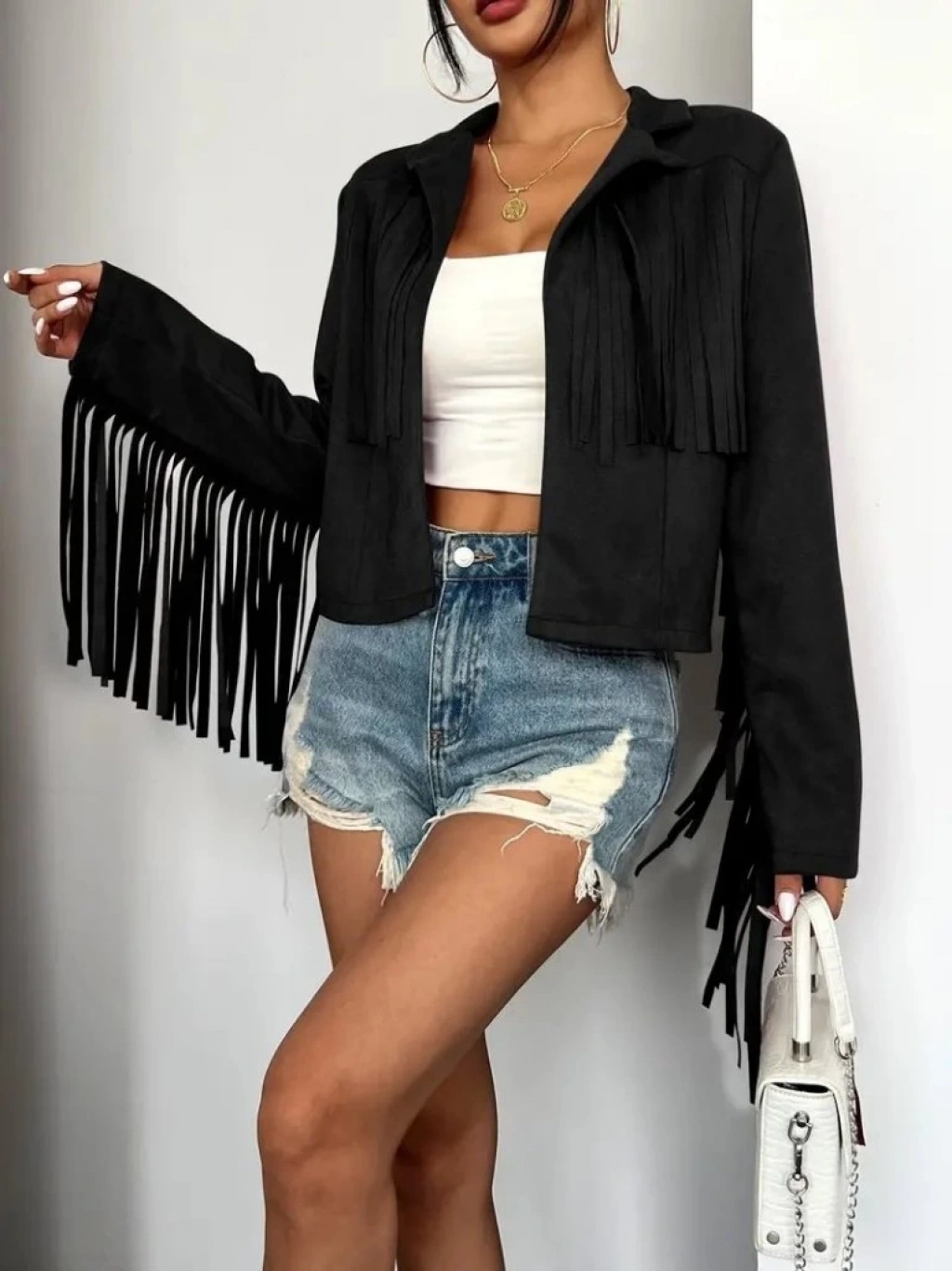 Kadın Uzun Kollu Yakalı Kısa Püsküllü Süet Ceket