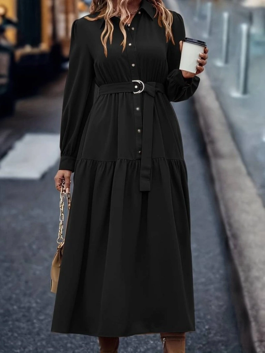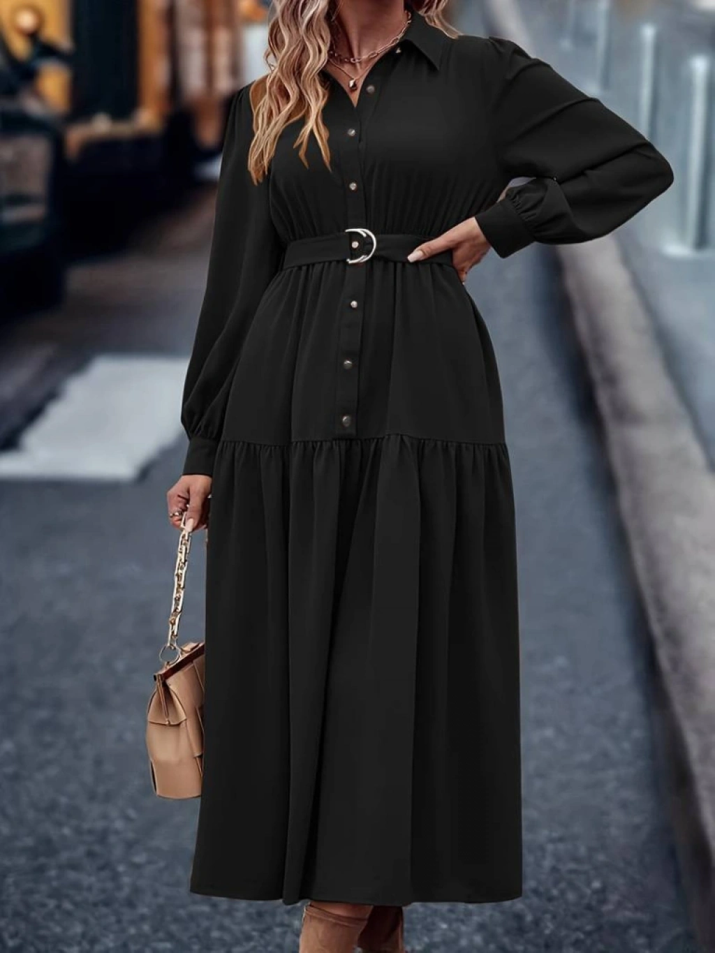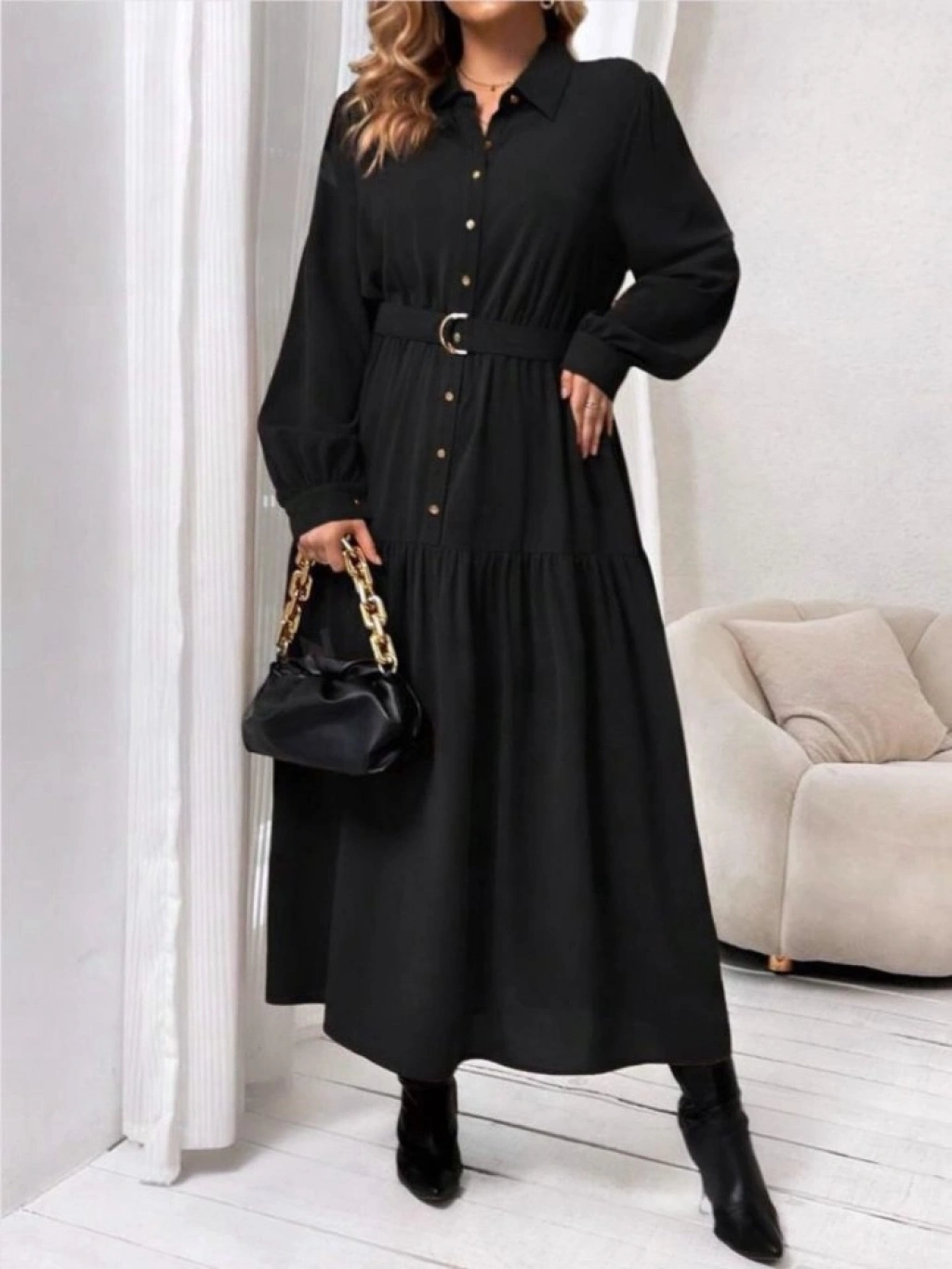 Kadın Uzun Kollu Yakalı önden Düğmeli Beli Metal Kemerli Dokuma Maksi Elbise