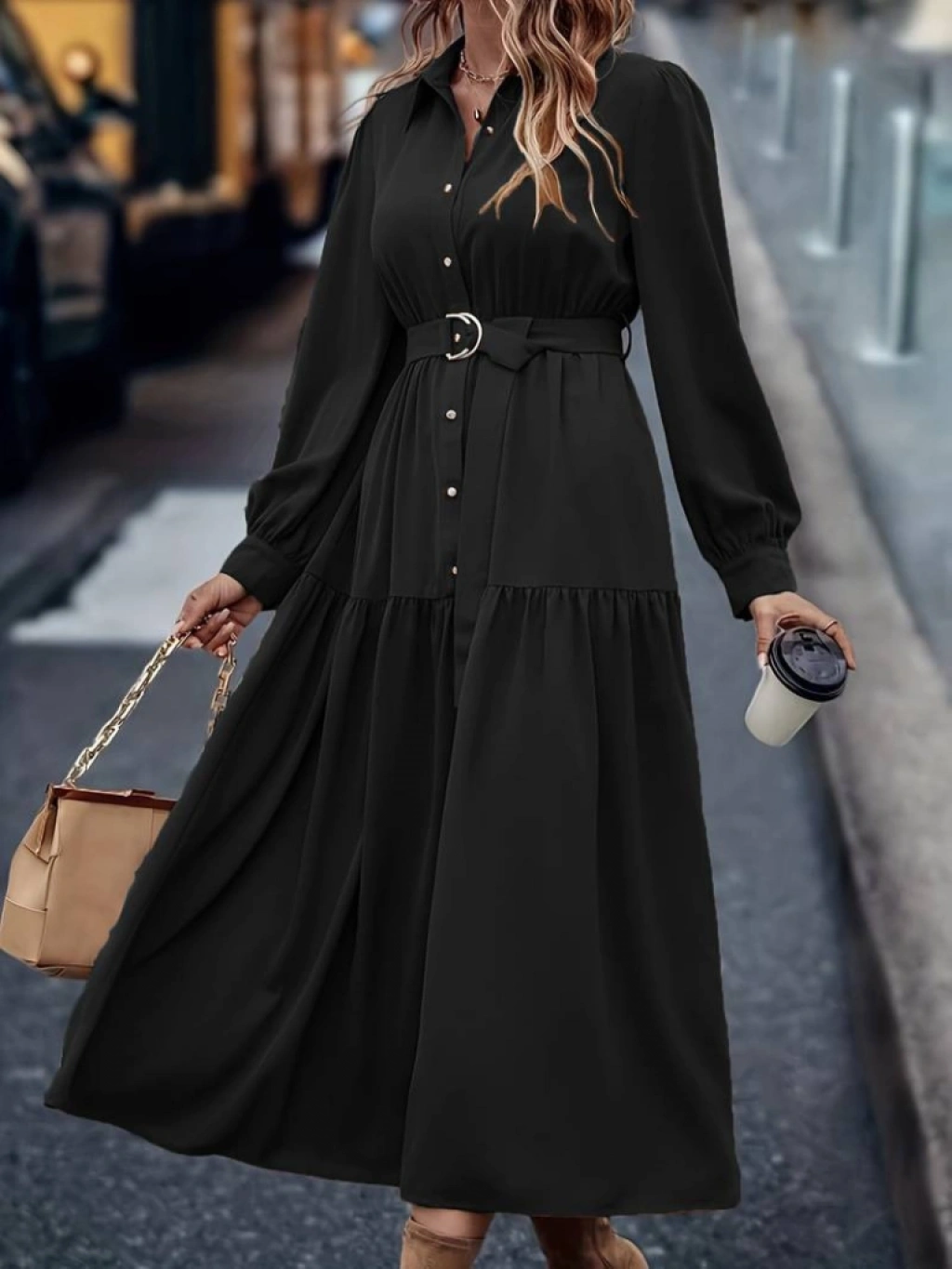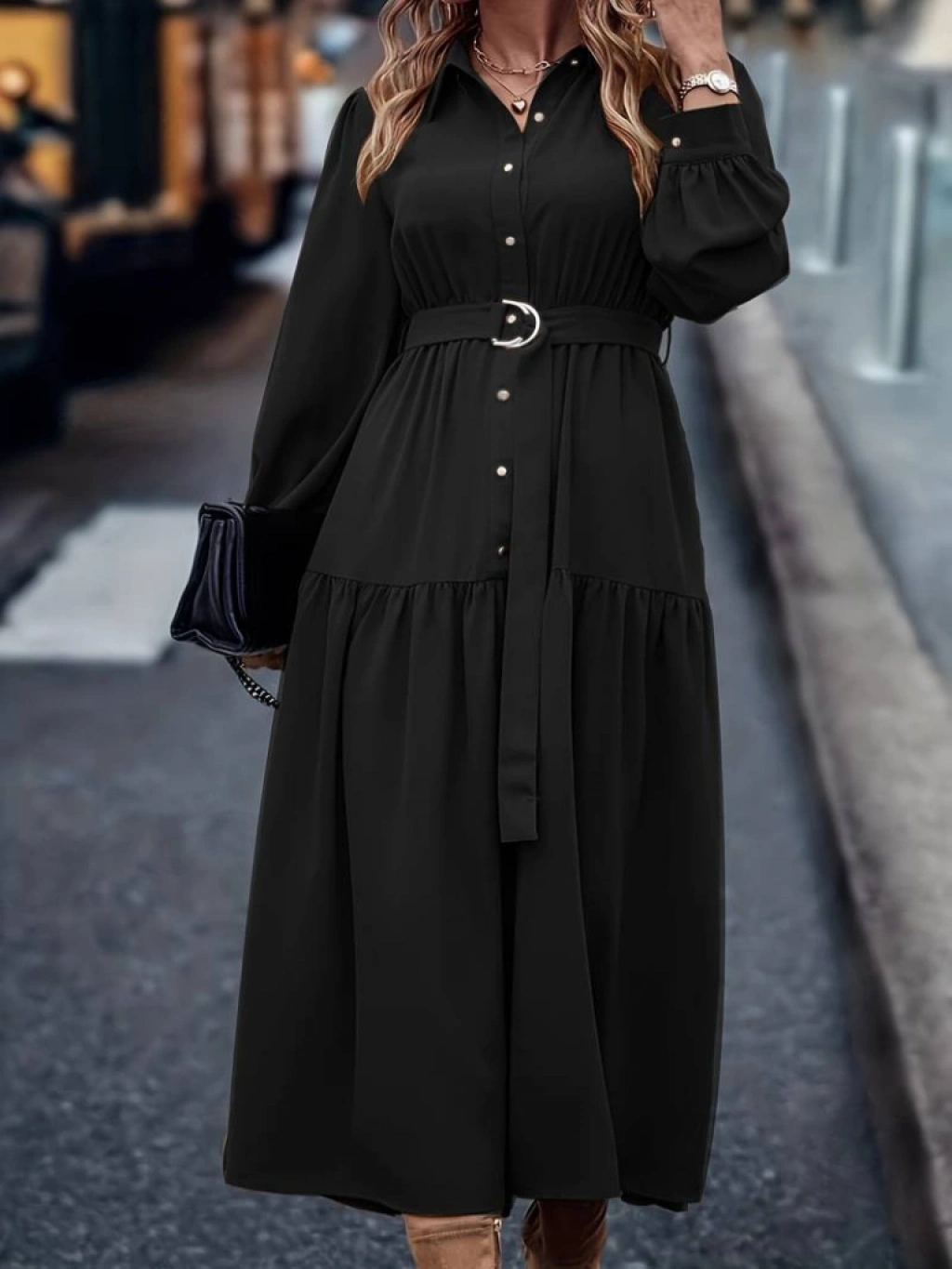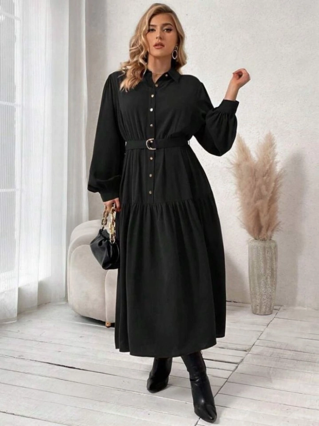 Kadın Uzun Kollu Yakalı önden Düğmeli Beli Metal Kemerli Dokuma Maksi Elbise