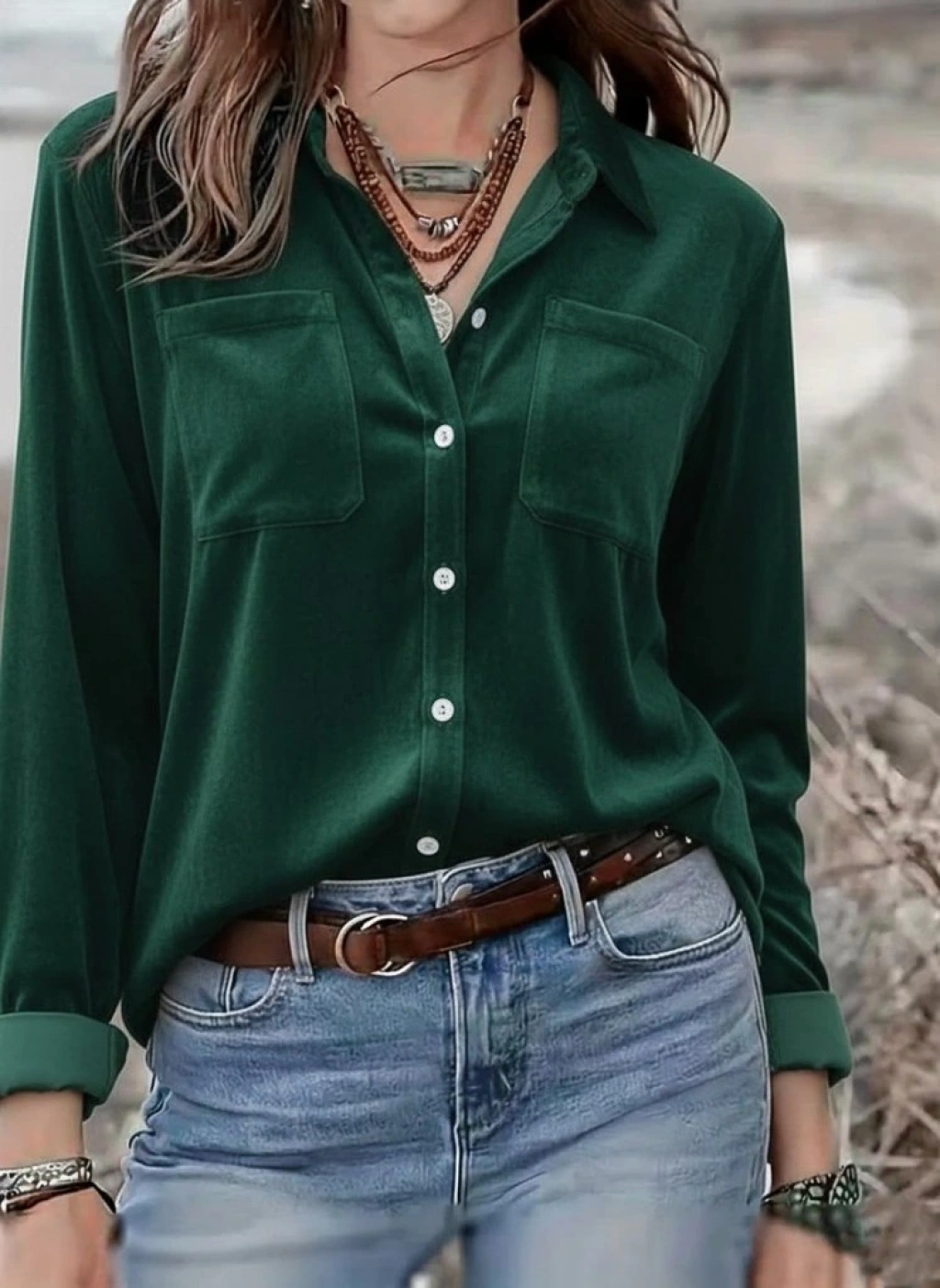 Kadın Uzun Kollu Yakalı önden Düğmeli Cep Detaylı Kadife Gömlek
