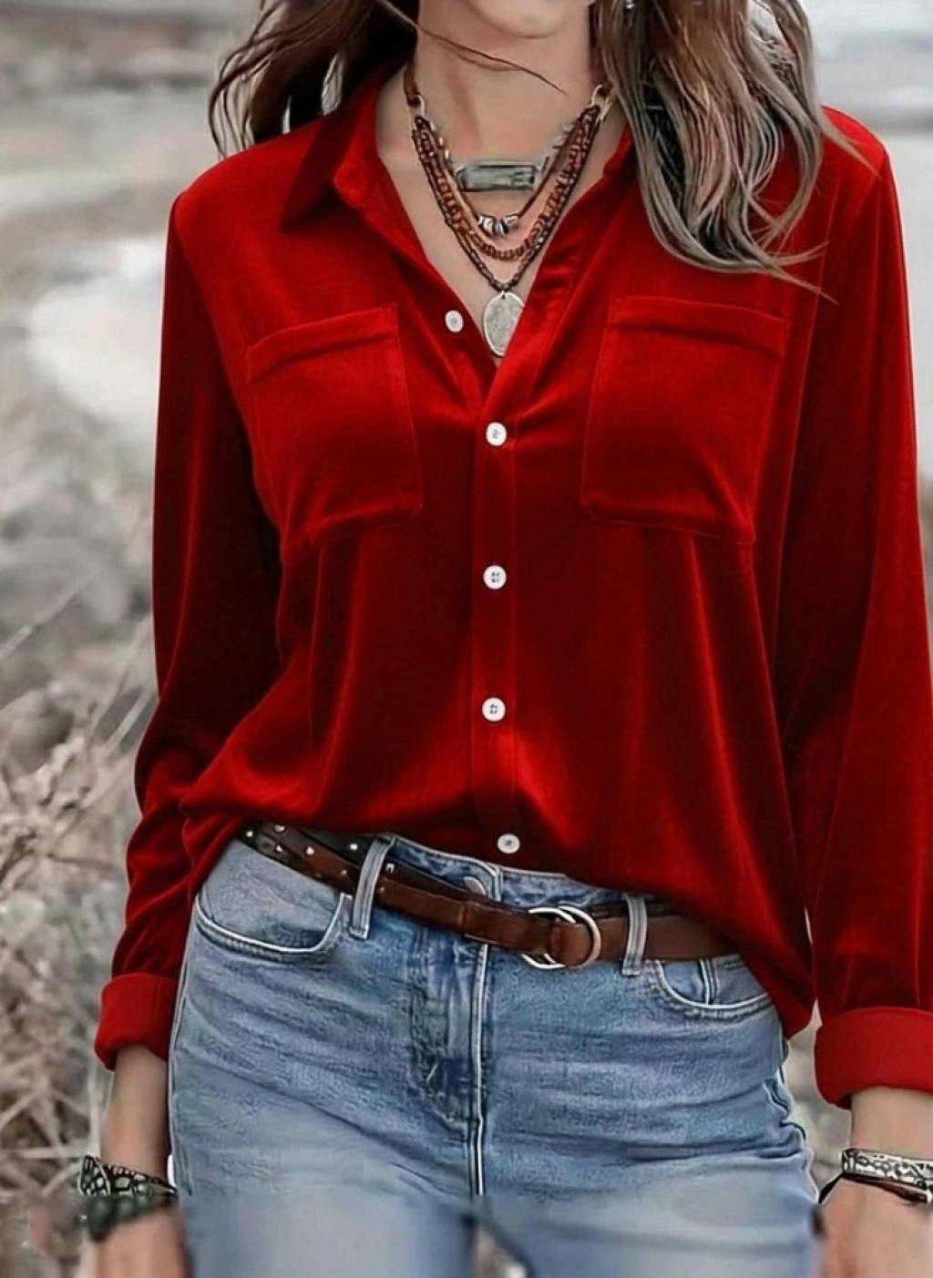 Kadın Uzun Kollu Yakalı önden Düğmeli Cep Detaylı Kadife Gömlek