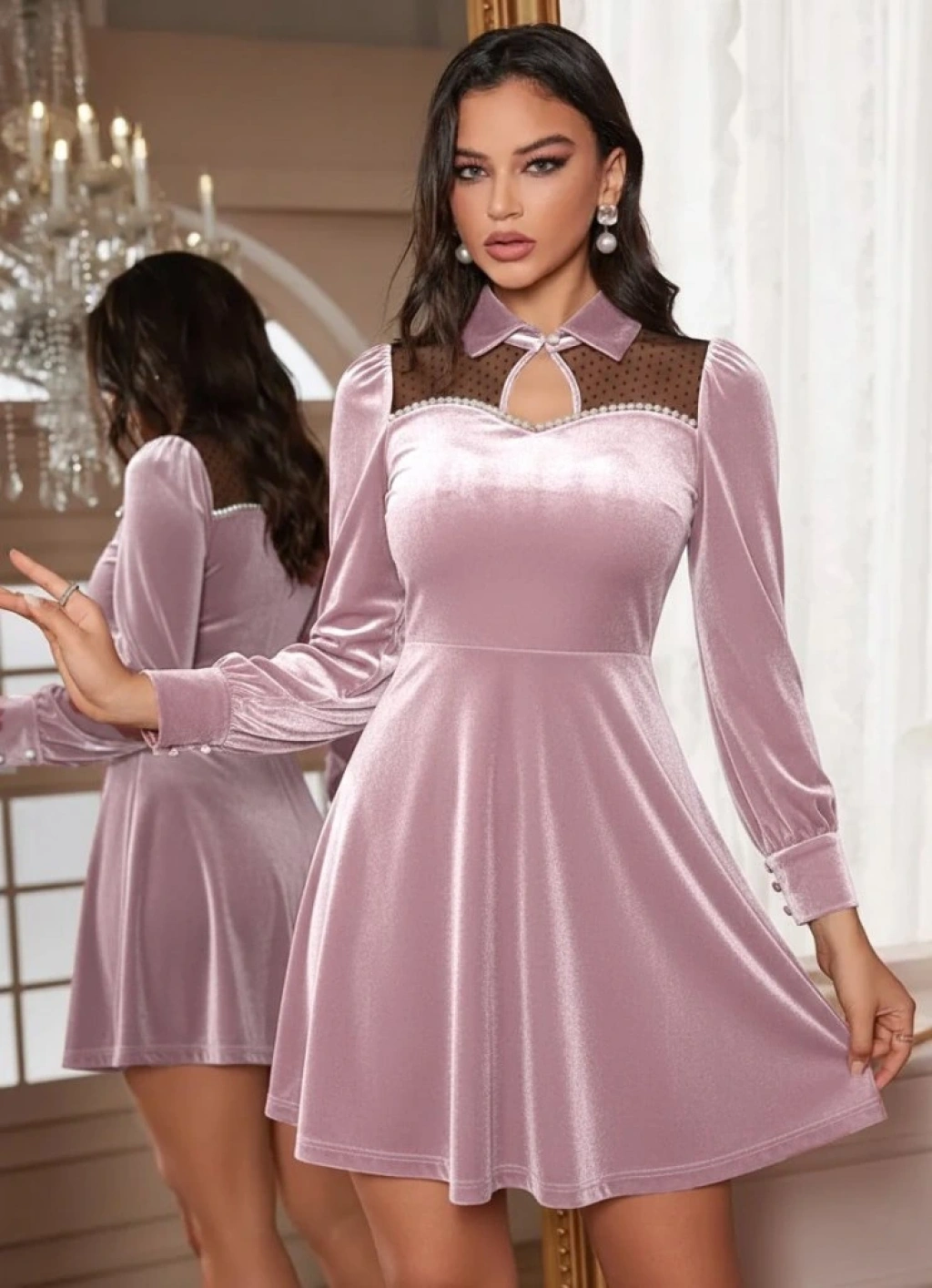 Kadın Uzun Kollu Yakalı Tül Detaylı Incili Mini Kadife Elbise