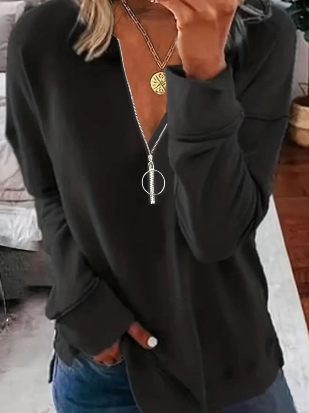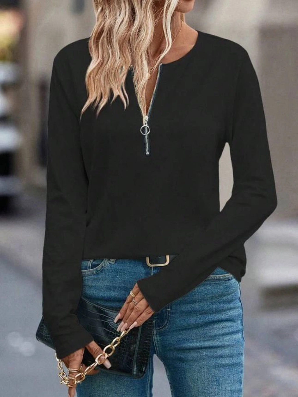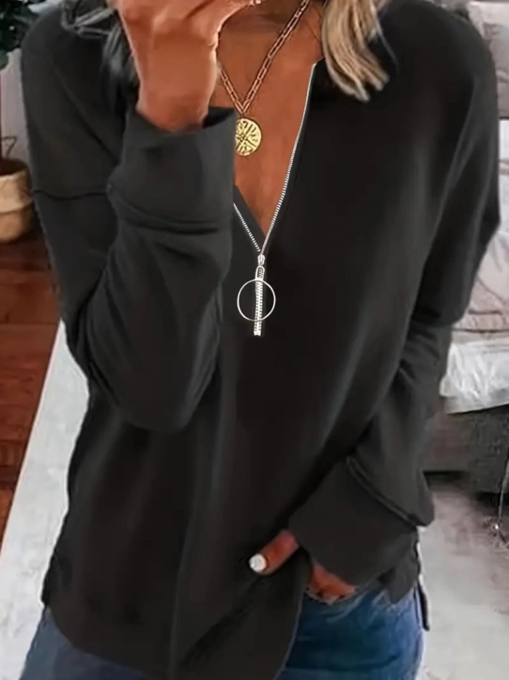 Kadın Uzun Kollu Yakası Açık Fermuarlı Viskon Bluz