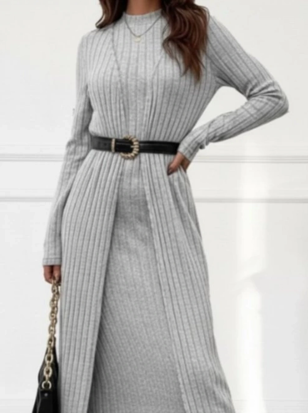 Kadın Uzun Kollu Yarı Balıkçı Yaka şardonlu Kaşkorse Elbise Ve Uzun Hırka Ikili Takım