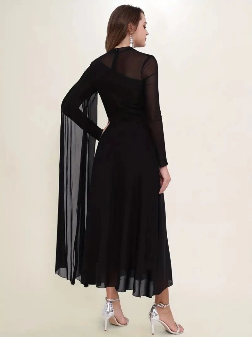 Kadın Uzun Kollu Yarı Balıkçı Yaka Tül Detaylı Uzun Sandy Elbise