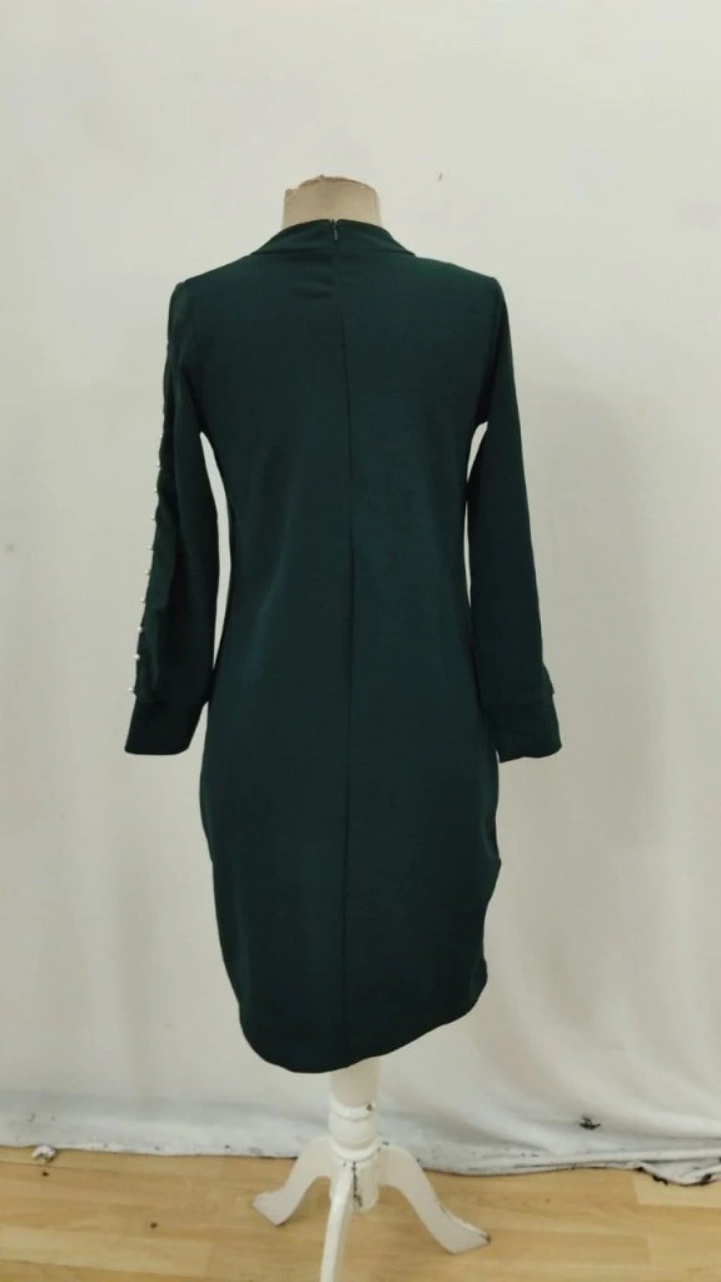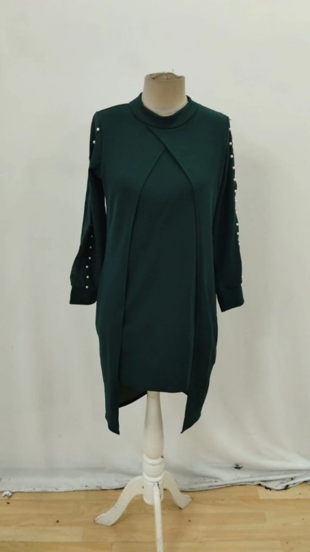 Kadın Uzun Kollu Yarı Balıkçı Yaka Tül Ve Inci Detaylı Kısa Ithal Krep Midi Elbise
