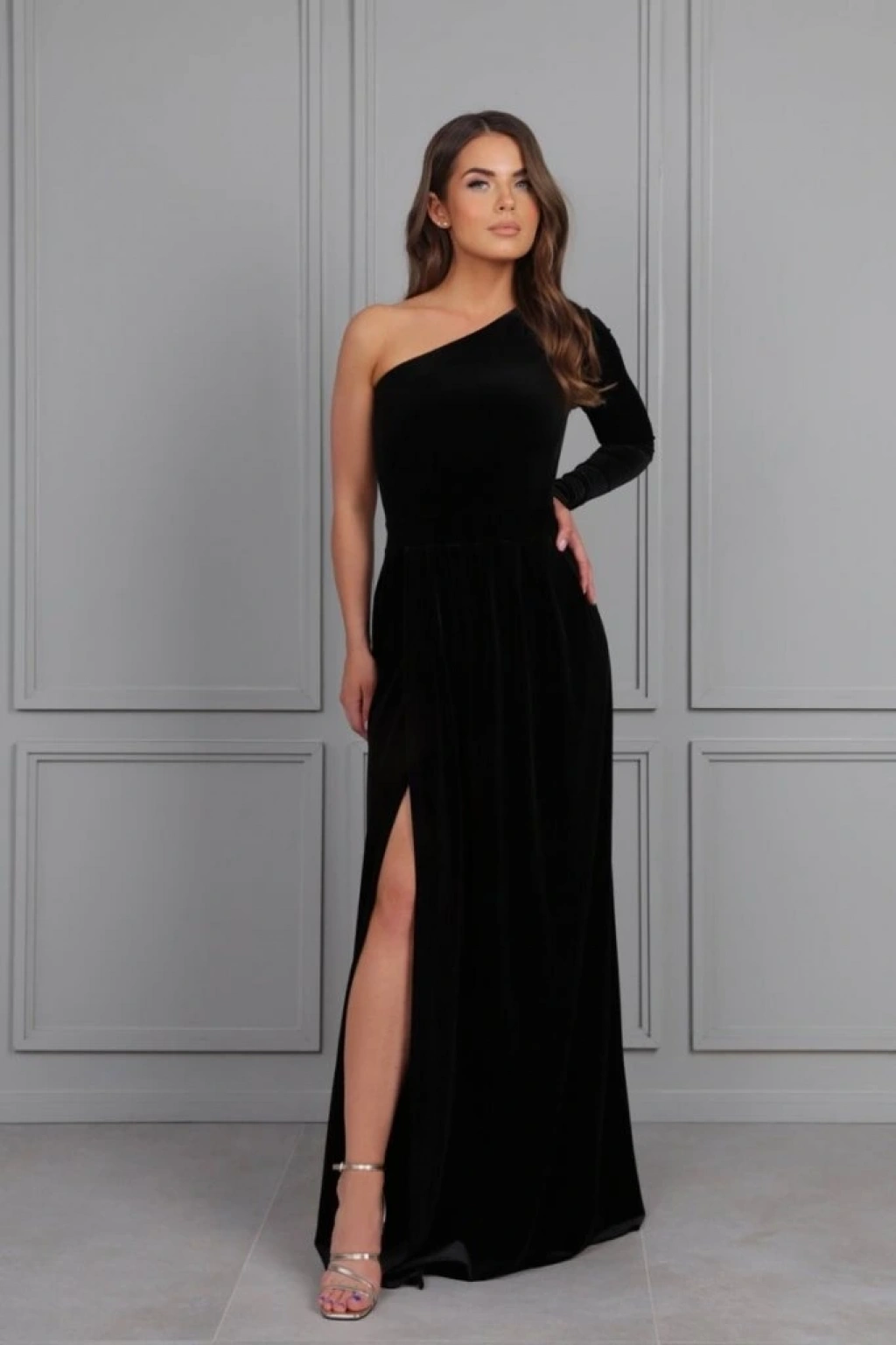 Kadın Uzun Kollu Yırtmaçlı önü Pile Detay Tek Kol Maxi Boy Kadife Elbise
