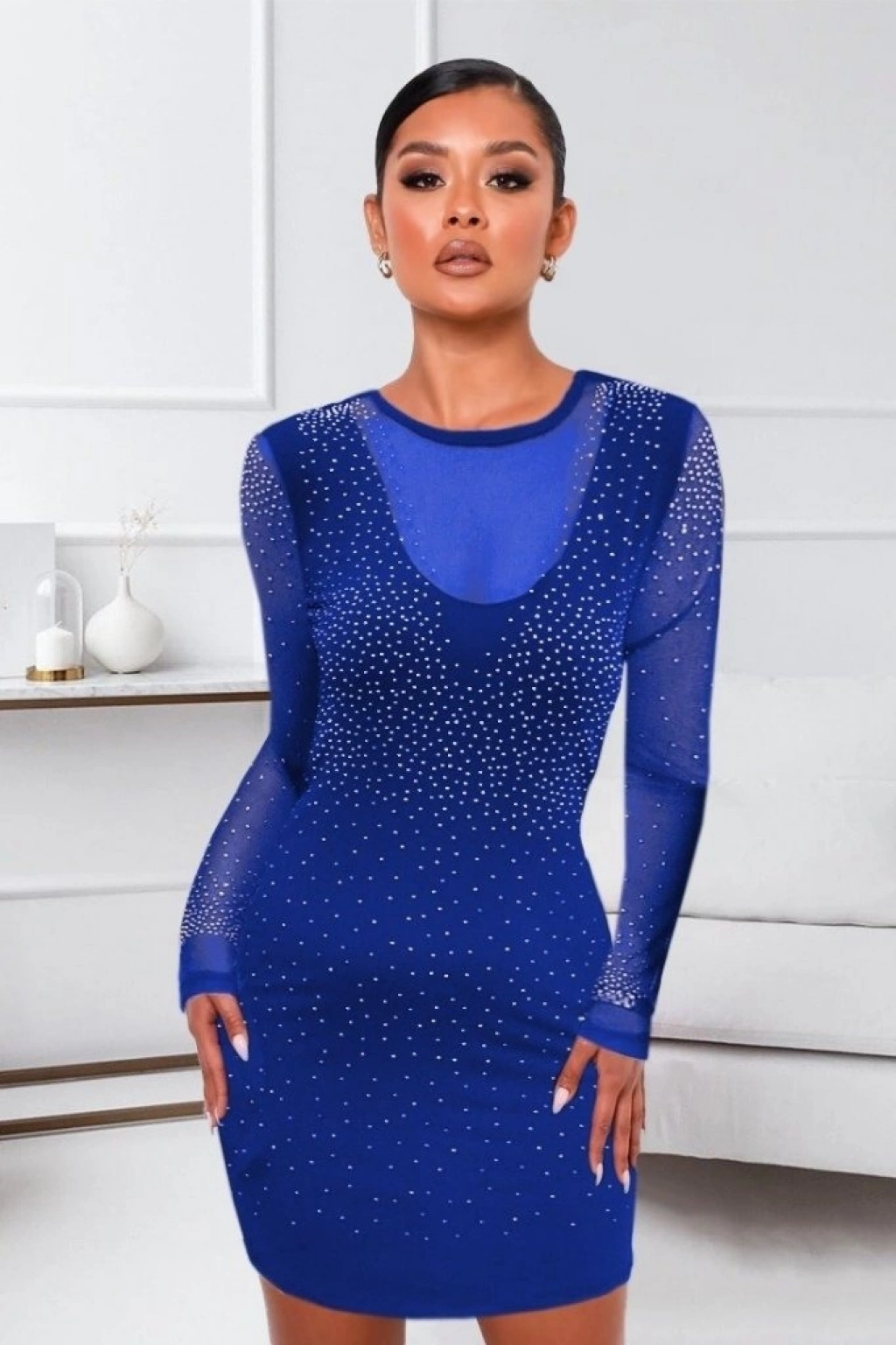 Kadın Uzun Kollu Yuvarlak Yaka Dekolteli Taşlı Dalgıç Elbise
