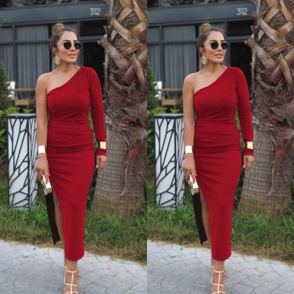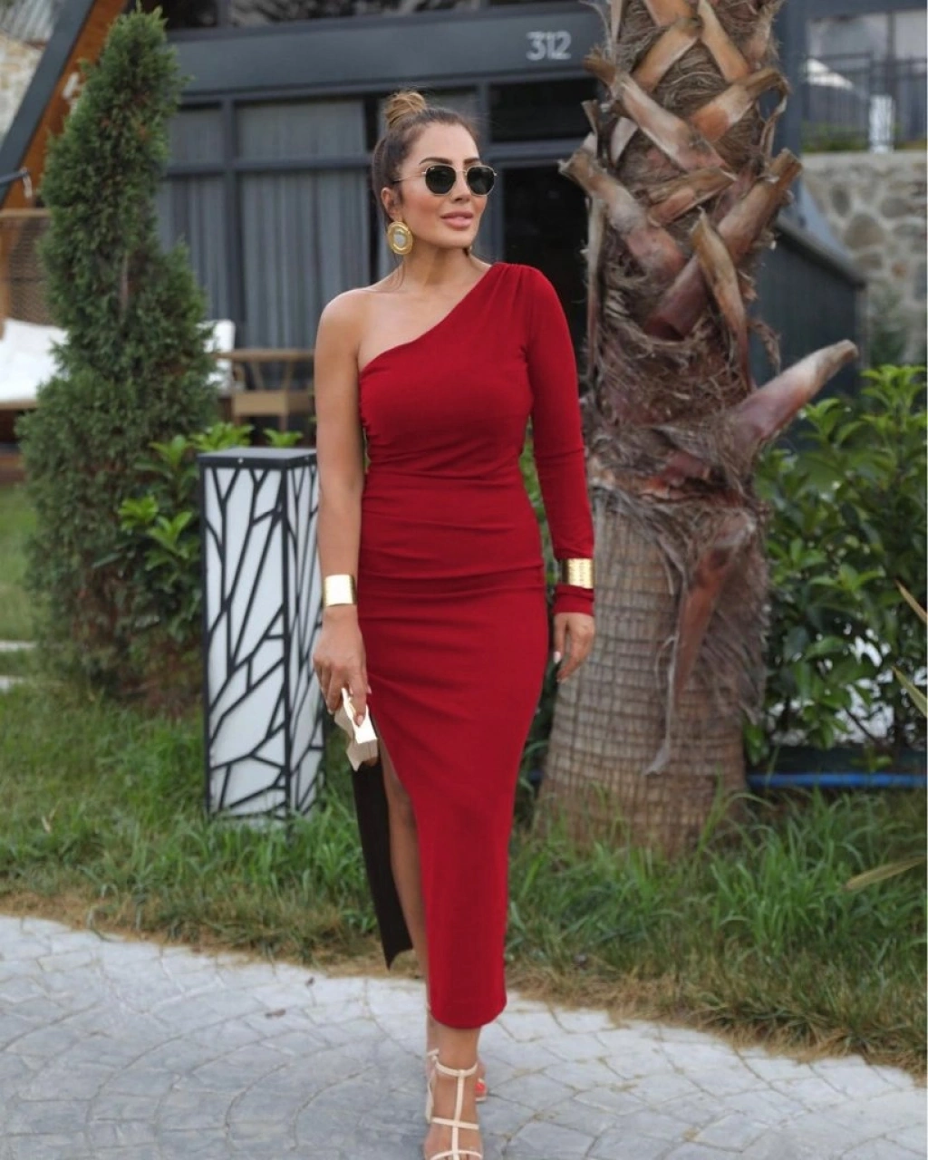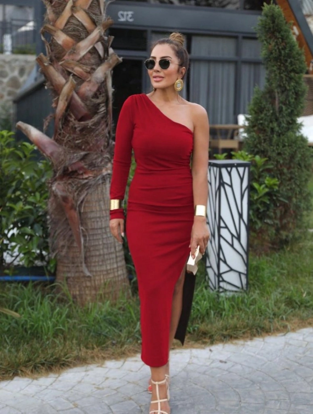Kadın Uzun Tek Kollu Yanı Büzgü Yırtmaçlı Sandy Midi Boy Elbise