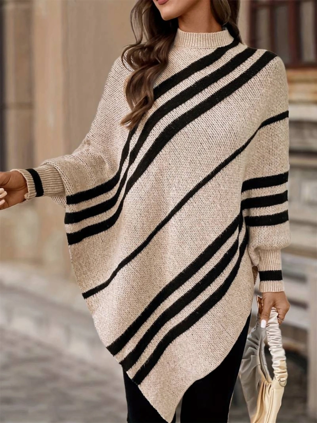 Kadın Uzun Yarasa Kollu Yüksek Boyunlu Asimetrik Kesim Triko Pelerin Kazak