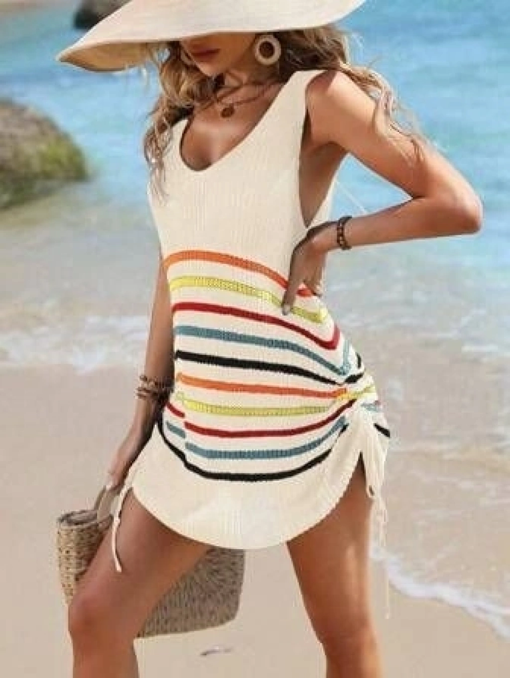 Kadın V Yaka çizgi Desenli Yanlar Asansör Büzgülü Triko Pareo