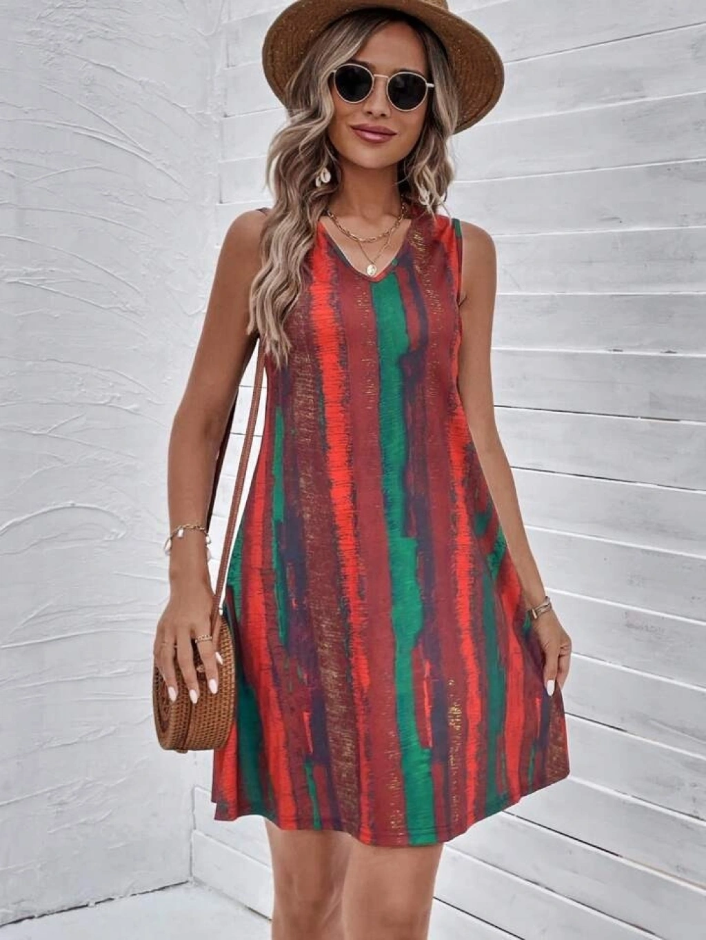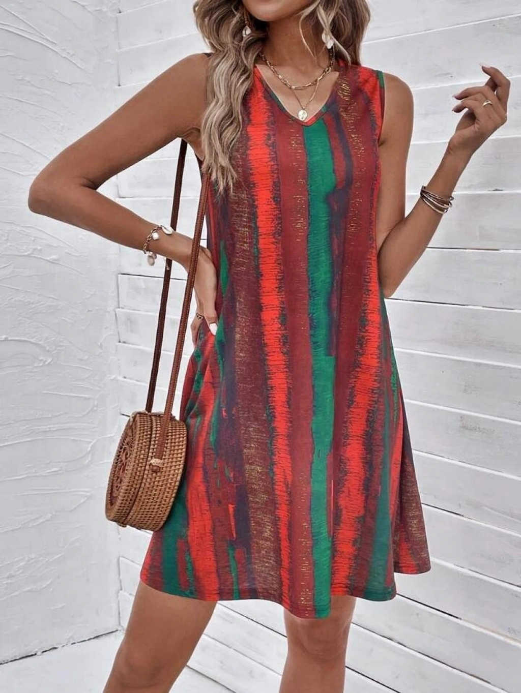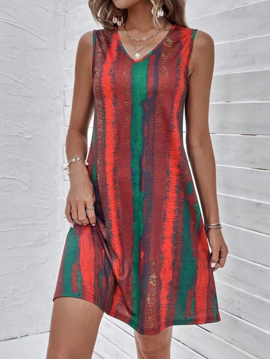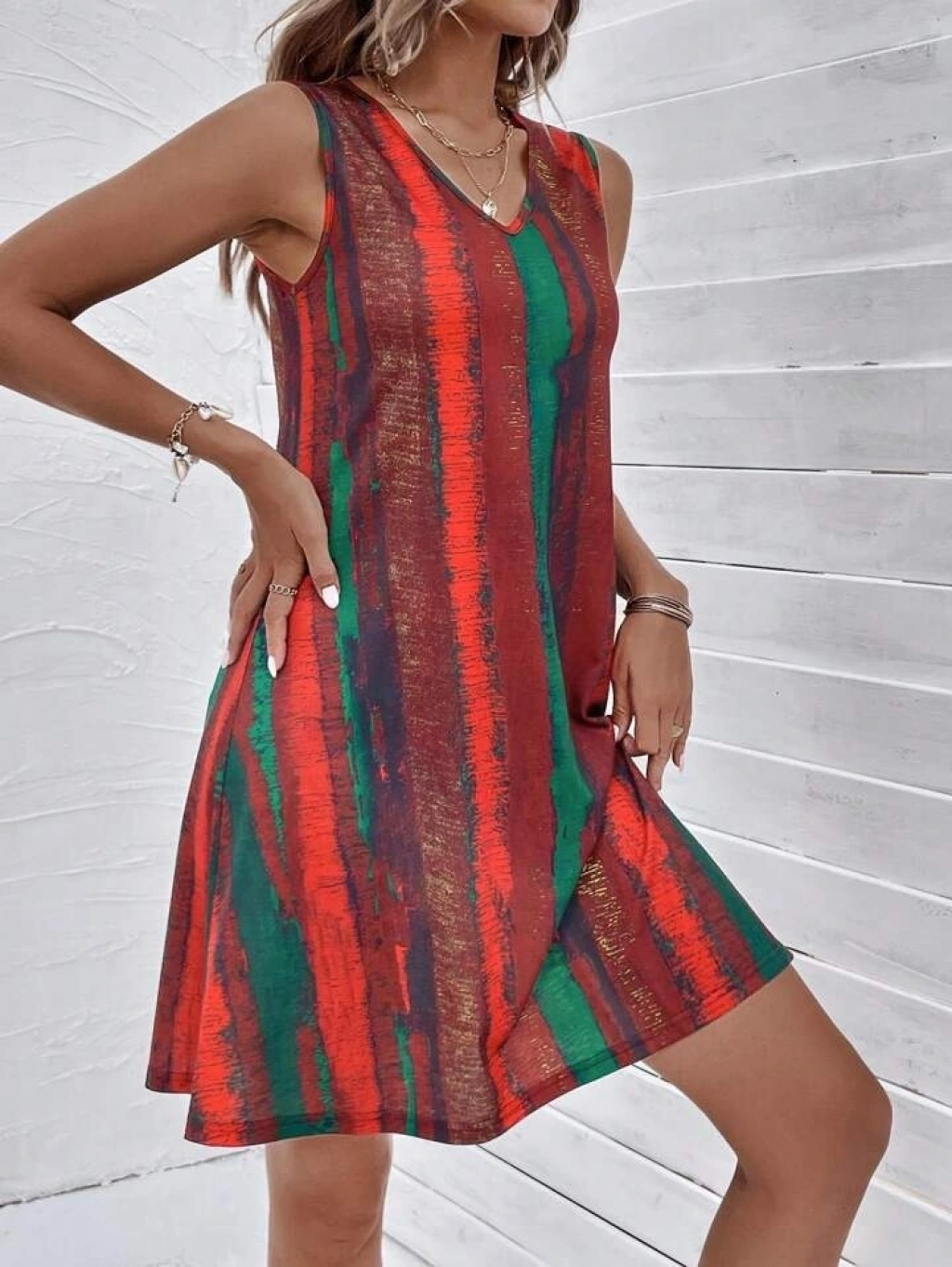 Kadın V Yaka Sıfır Kol Desenli Süprem Elbise