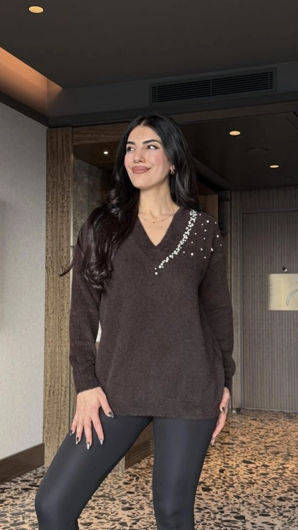 Kadın V Yaka Uzun Kollu Inci Detay Triko Bluz