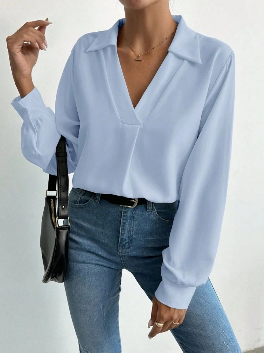 Kadın V Yaka Uzun Kollu Mosskrep Kumaş Bluz