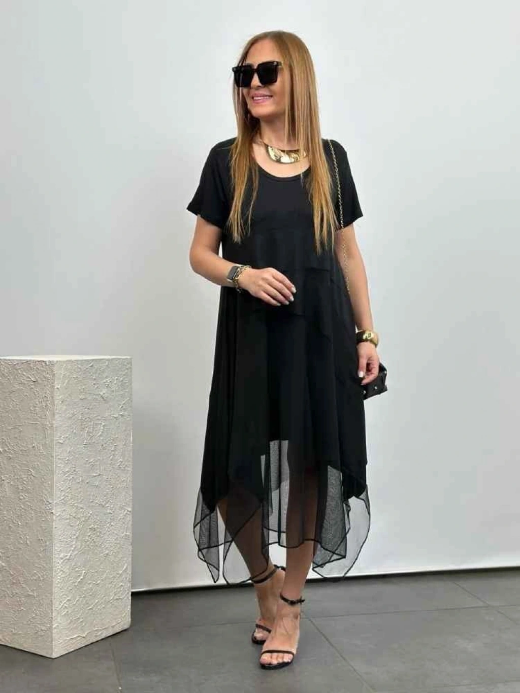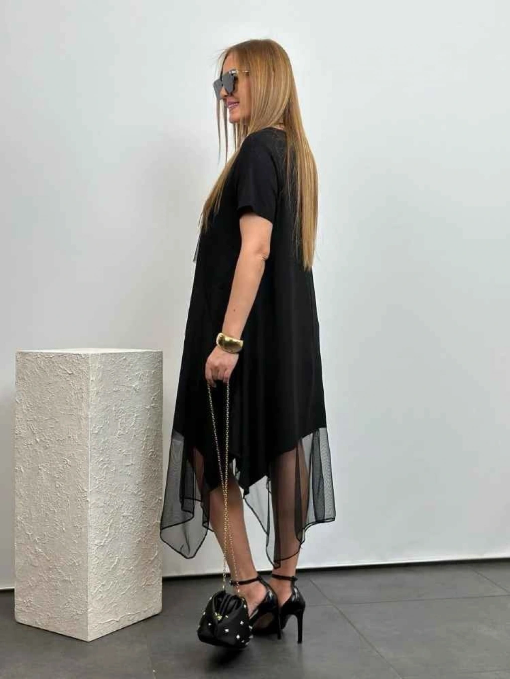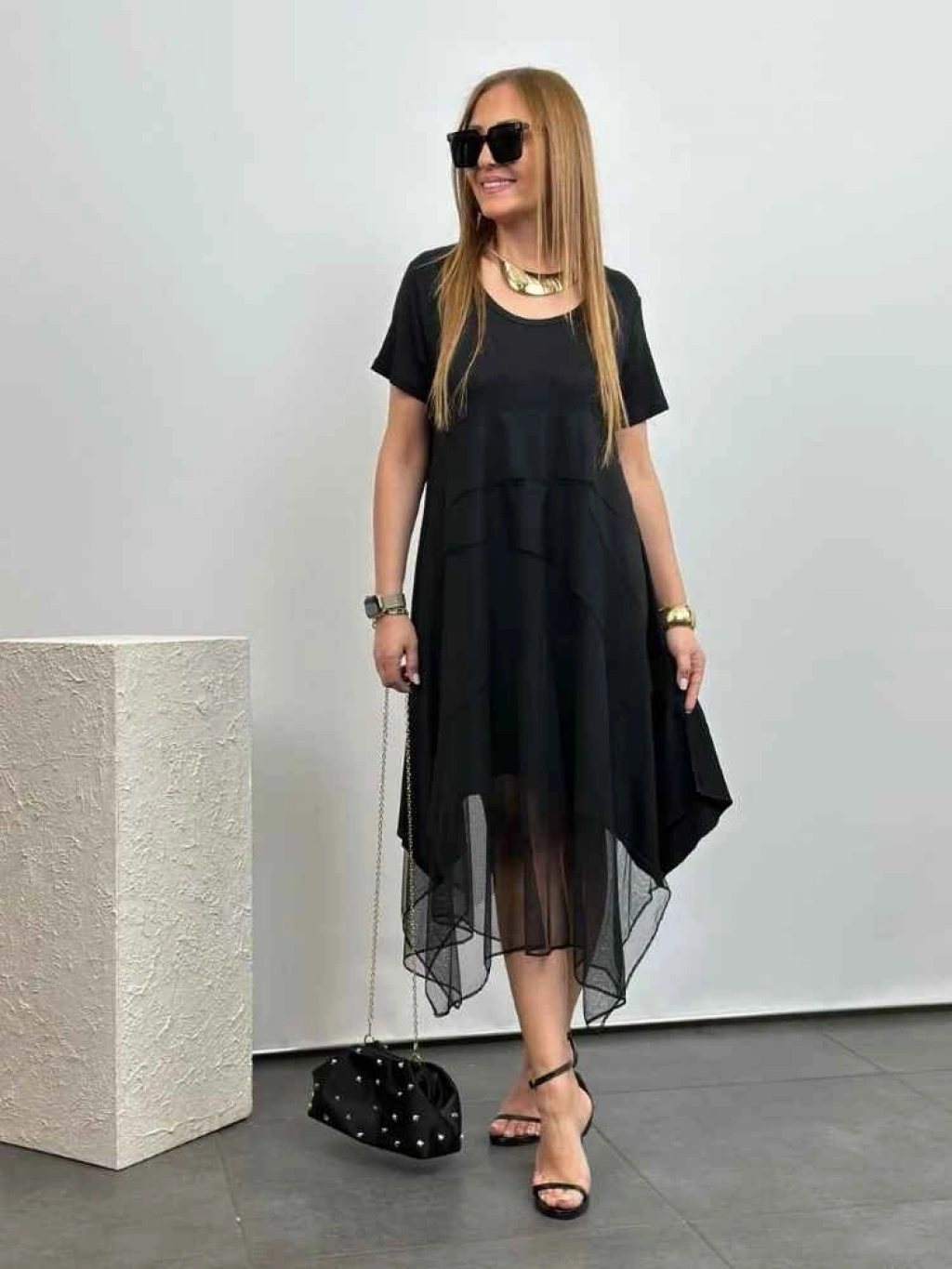 Kadın Viskon Kumaş Tül Detaylı Asimetrik Elbise