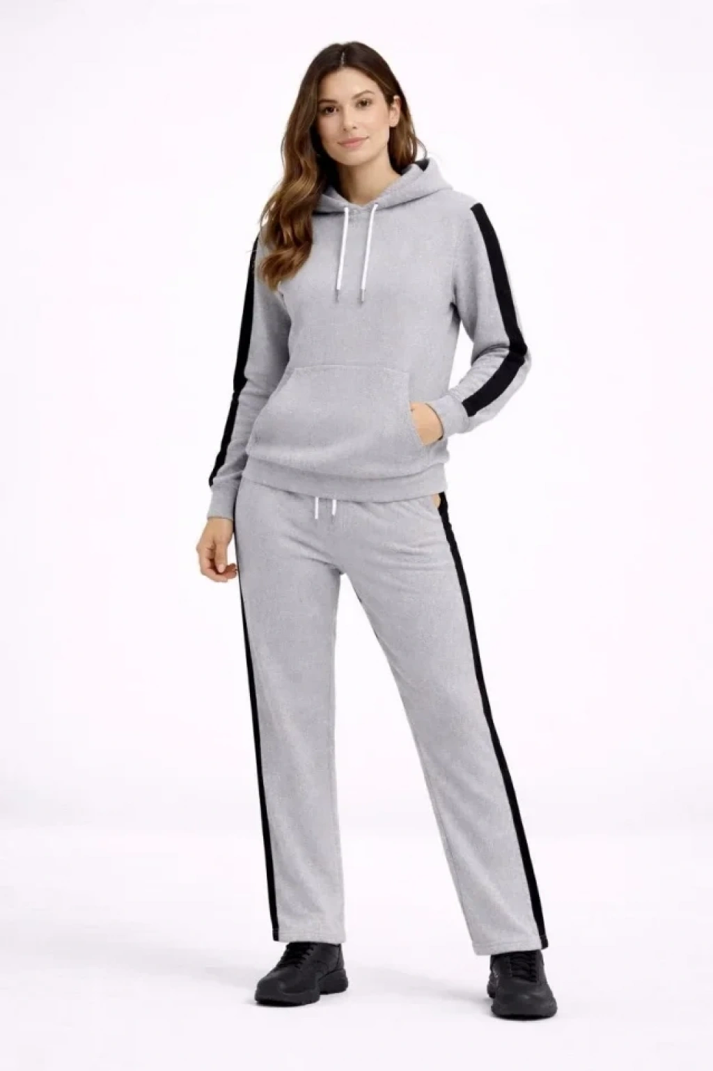 KADIN Yandan Şeritli Eşofman Takım Kapüşonlu Sweatshirt Boru Paça Alt, Oversize 3 Iplik Pamuklu - Gri