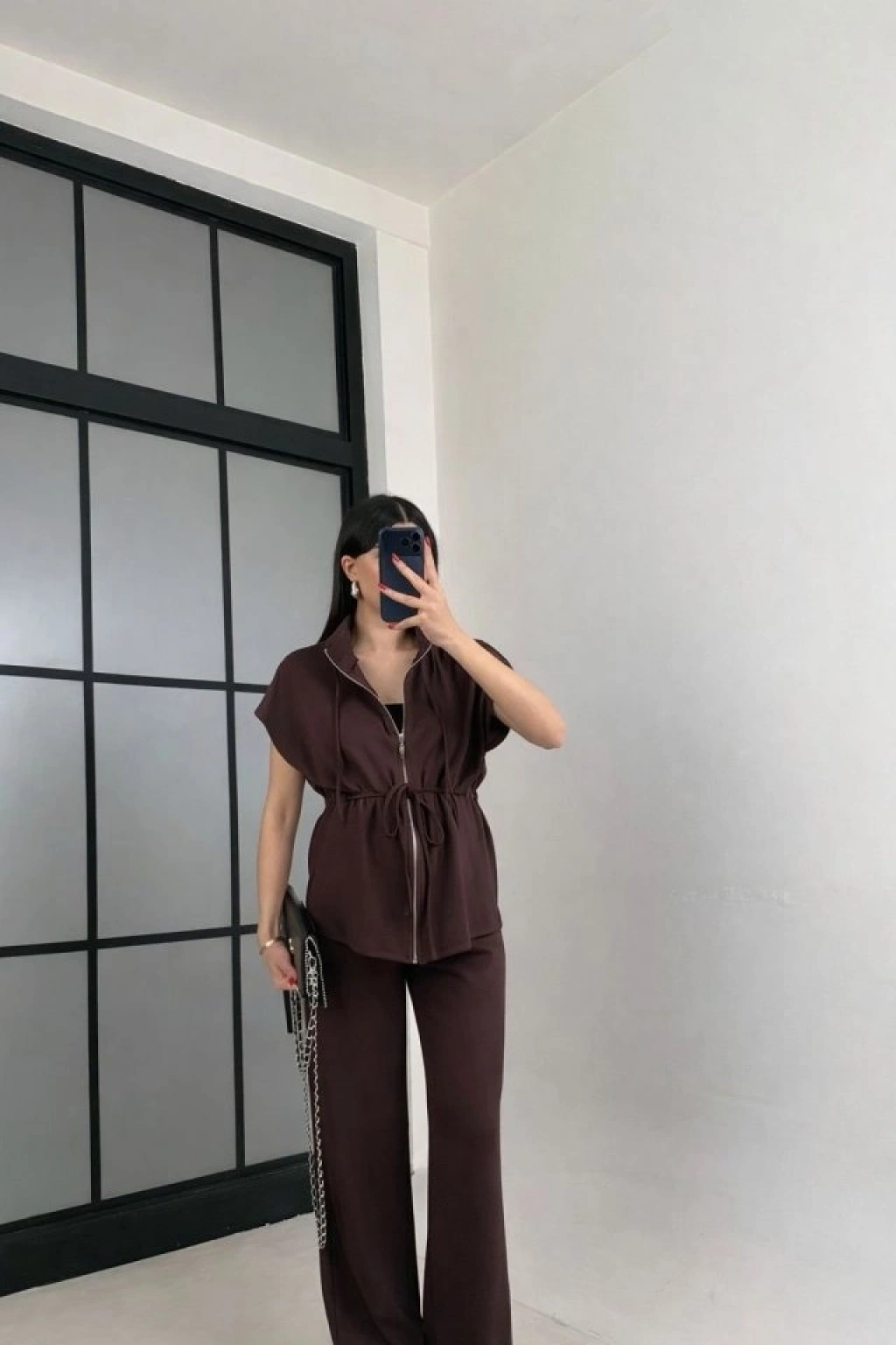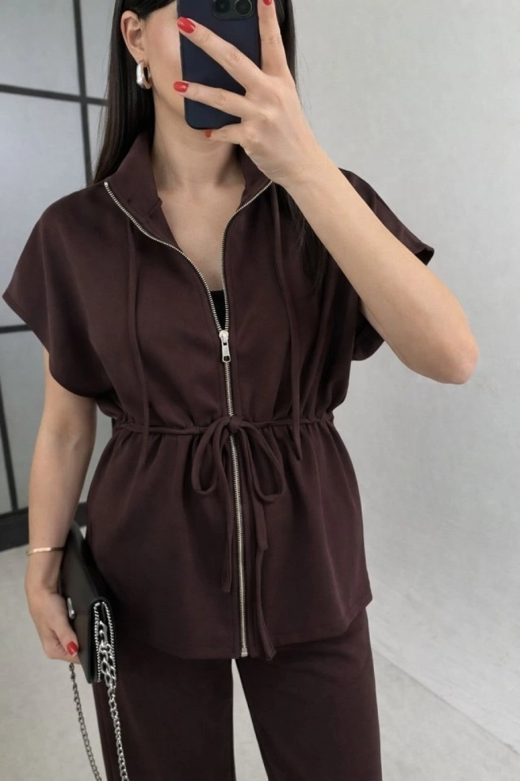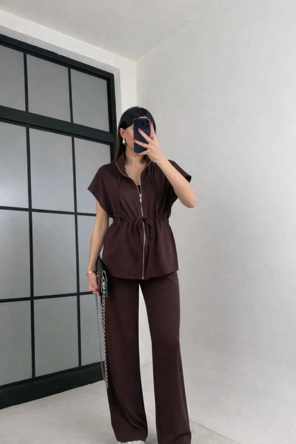 Kadın Yarasa Kol Fermuar Ve Lastikli Bağcık Detay Ceket Pantolon Ikili Takım