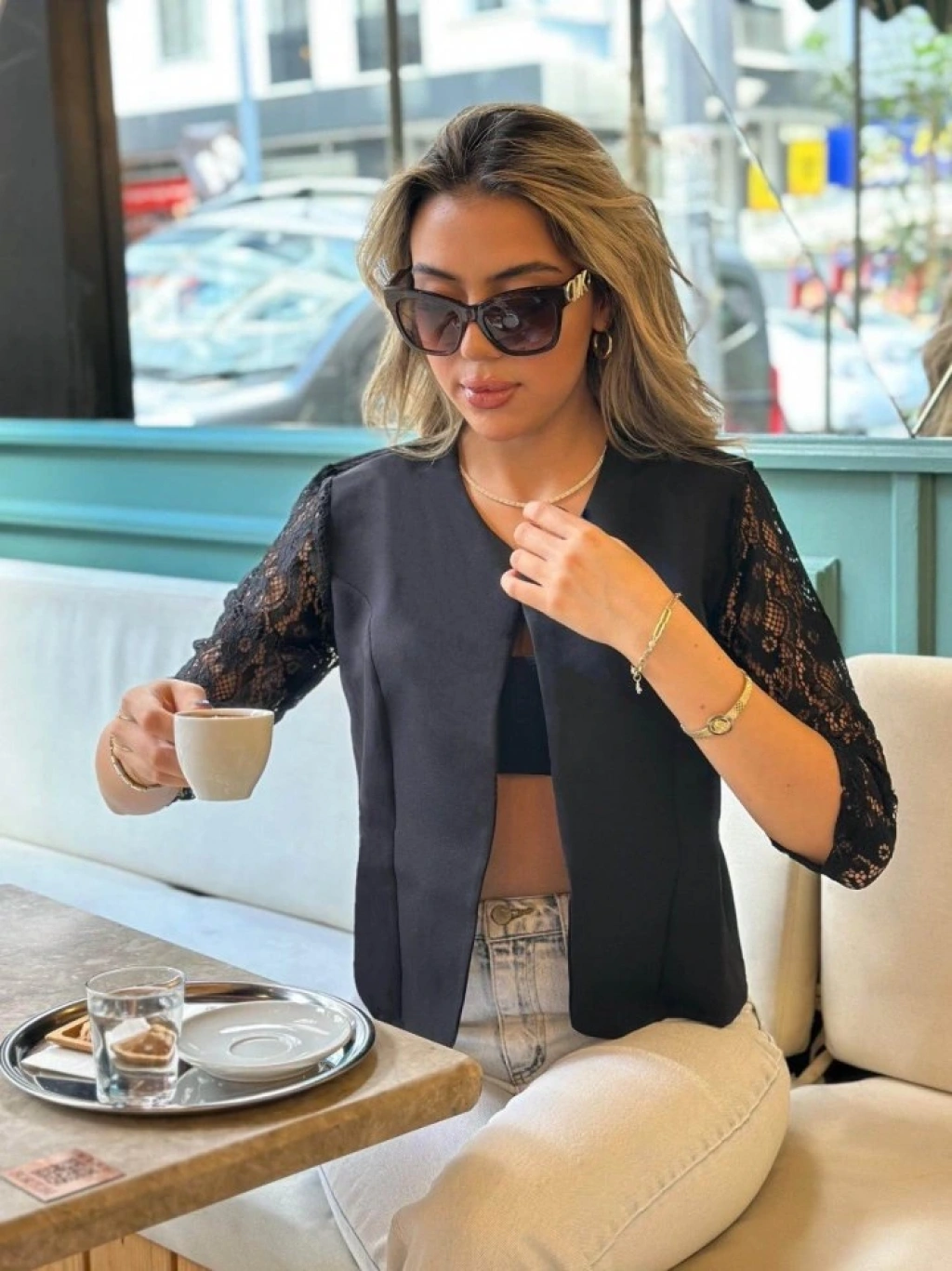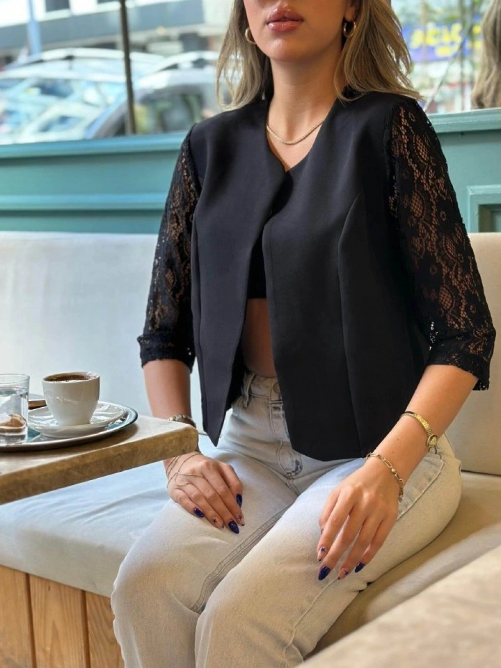 Kadın Yarım Dantel Kollu önü Açık Kısa Atlas Ceket