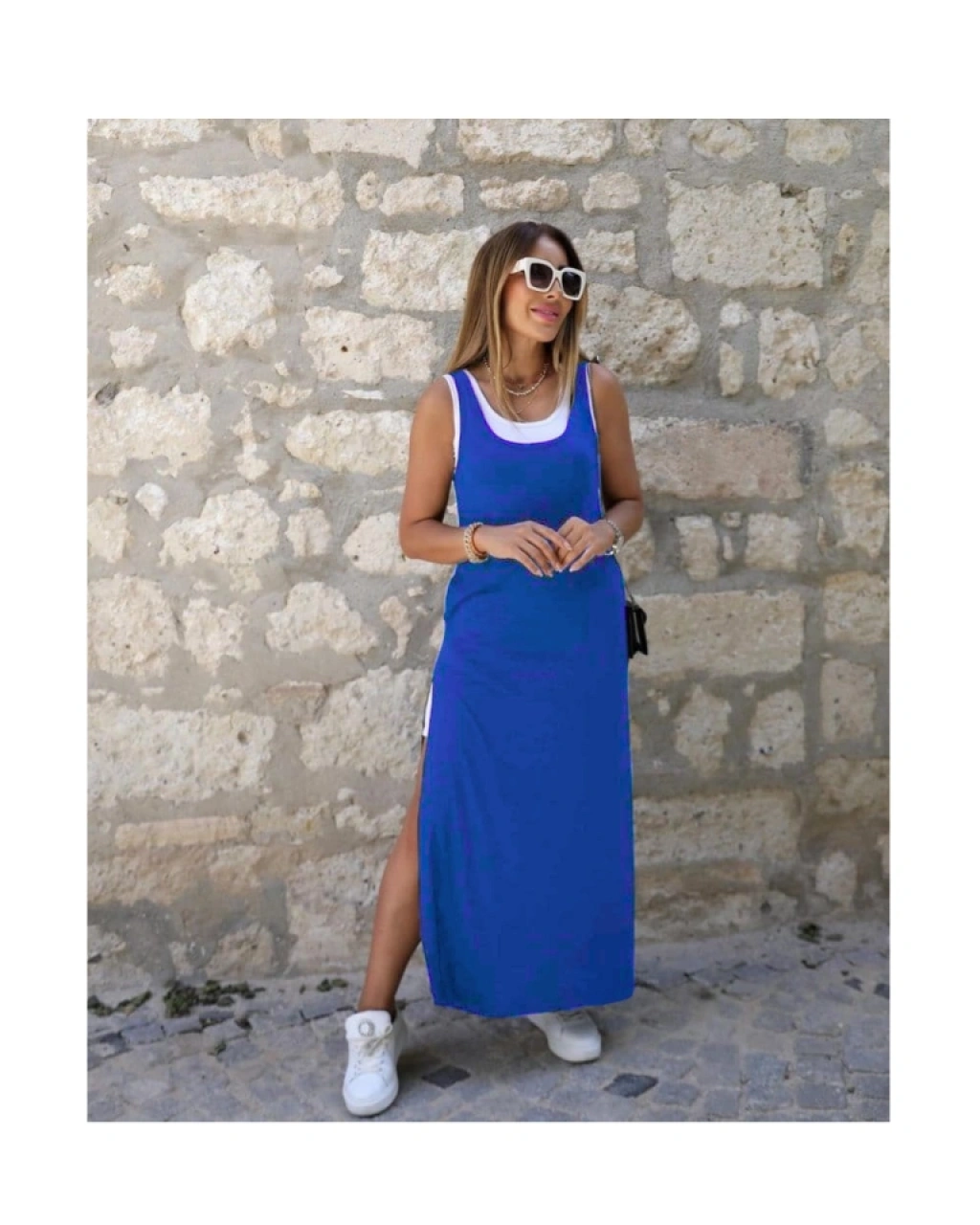 Kadın Yırtmaç Detaylı Viskon Kumaş Maxi Boy Cepli Iç Dahil Ikili Elbise