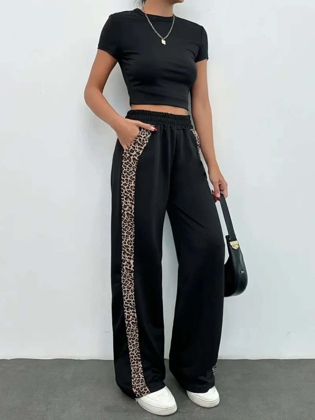 Kadın Yüksek Bel Bağcıklı Yanları Leopar Desenli Viskon Iki Iplik Pantolon