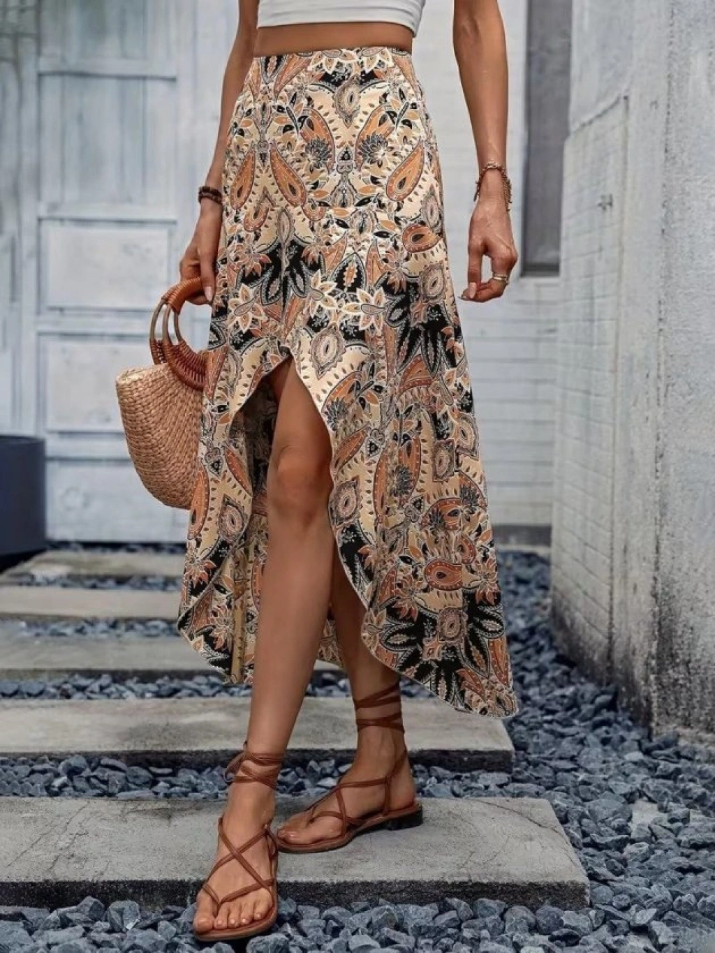 Kadın Yüksek Bel çiçek Desenli önü Asimetrik Detaylı Uzun Süprem Etek