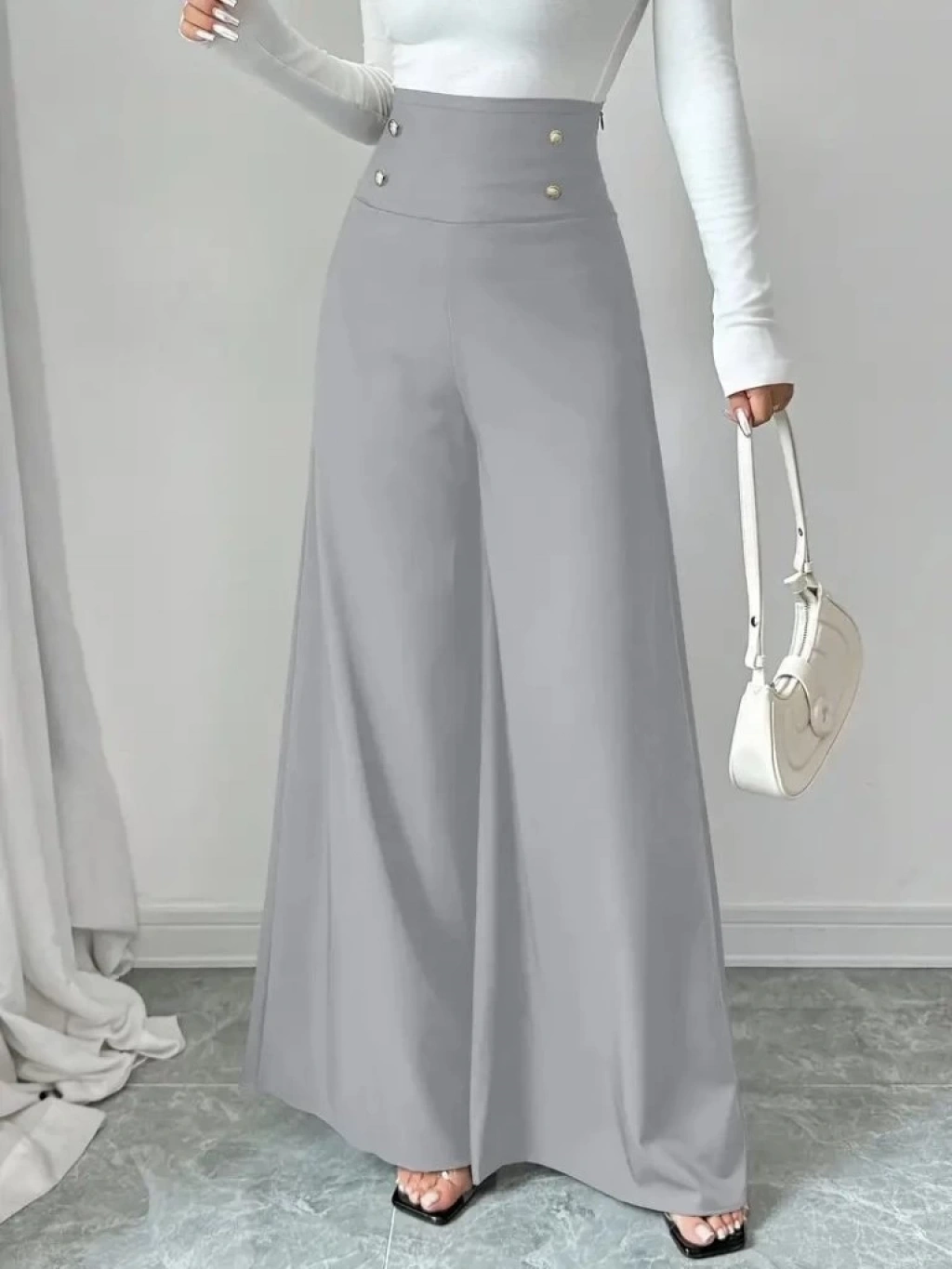Kadın Yüksek Bel Düğmeli Geniş Paçalı Ithal Krep Pantolon